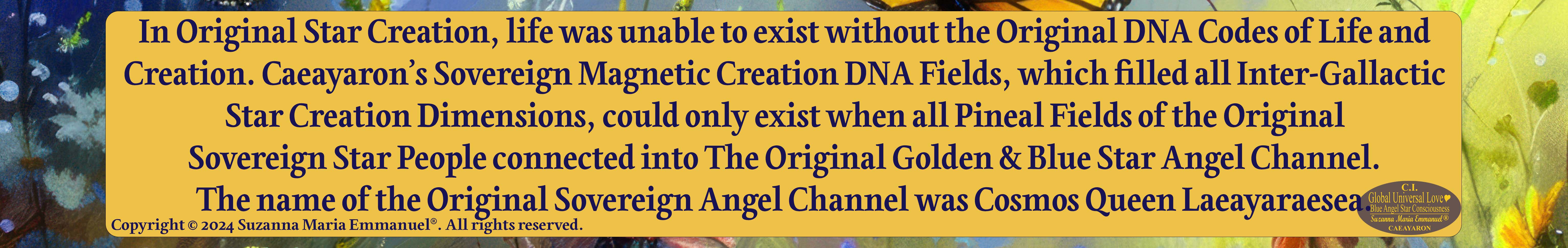 The Sovereign Universal Love Master Teachers are Caeayaron & Sovereign Lord Emmanuel, who can only work directly with their original Designated Messianic Sovereign Universal Love Blue Star Angel Channel, Suzanna Maria Emmanuel. All original Sovereign Cosmos Intellect is transmitted by Suzanna Maria Emmanuel.