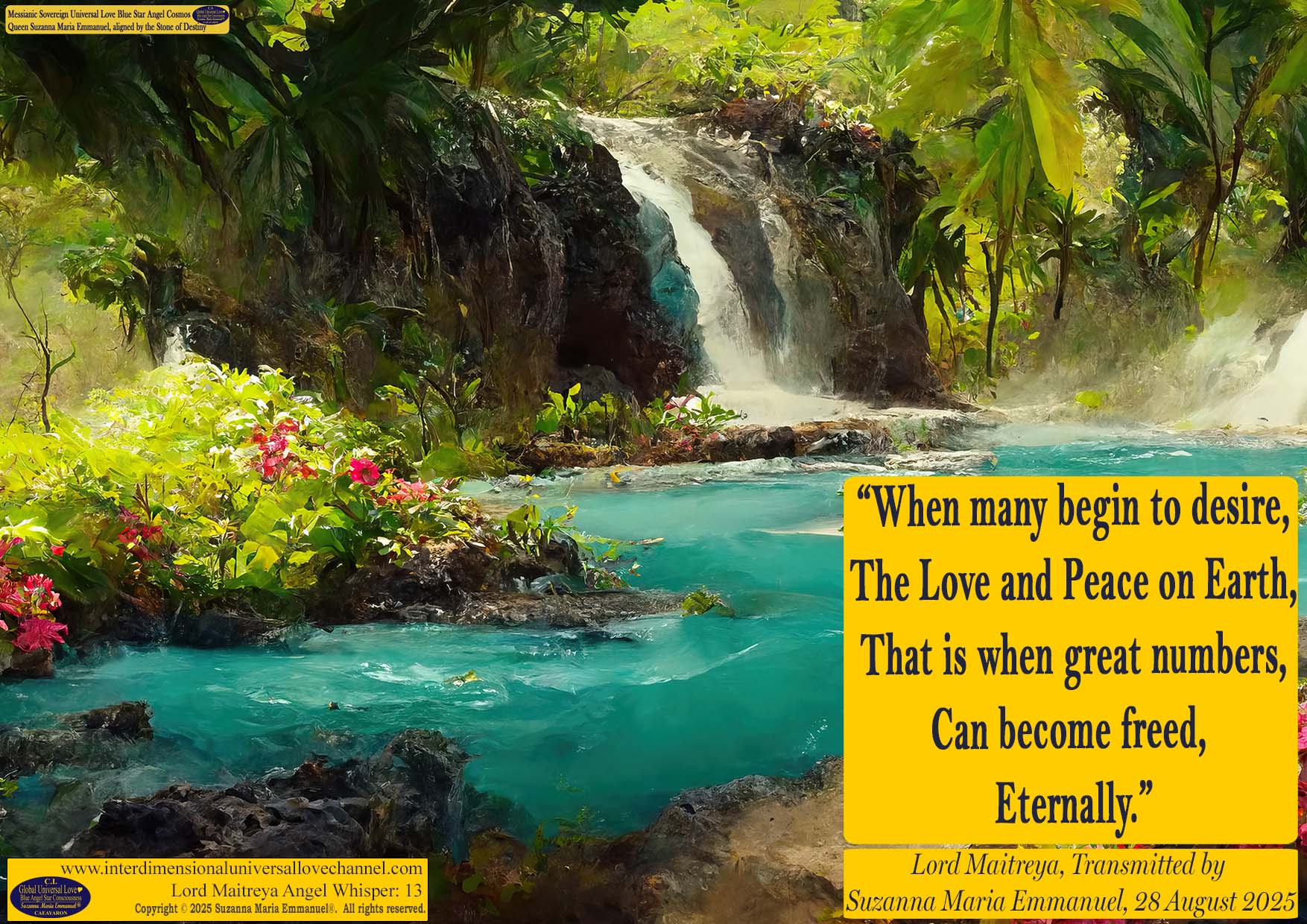 Terms & Conditions apply to all Sovereign Universal Love Angel Webinar Transmissions of Suzanna Maria Emmanuel. All Suzanna Maria Emmanuel's transmissions carry full trademark and copyright protection. All her work carries a full Disclaimer & Indemnity clause. Copyright © 2026 Suzanna Maria Emmanuel®. All rights reserved.