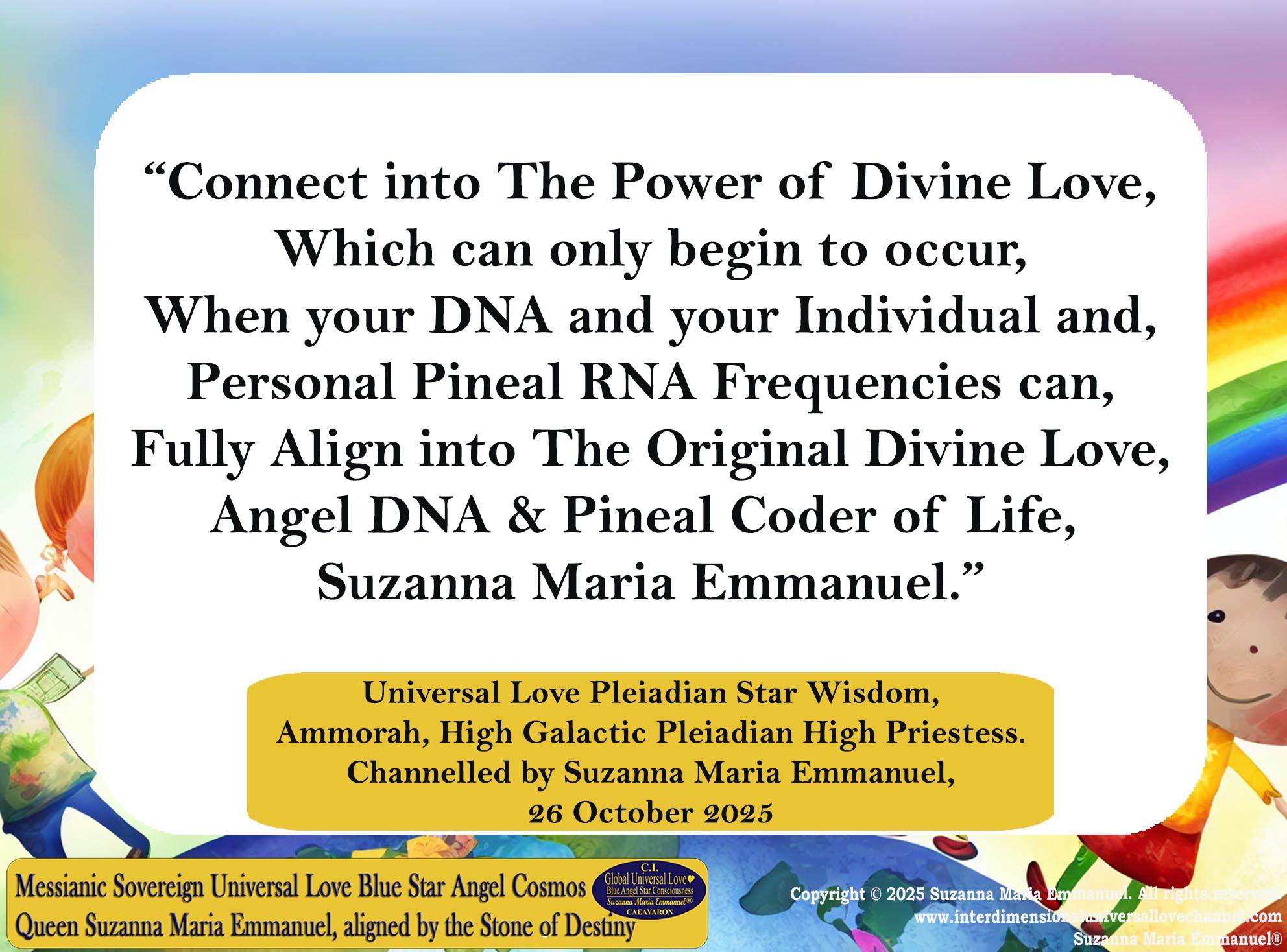 Terms & Conditions apply to all Sovereign Universal Love Angel Webinar Transmissions of Suzanna Maria Emmanuel. All Suzanna Maria Emmanuel's transmissions carry full trademark and copyright protection. All her work carries a full Disclaimer & Indemnity clause. Copyright © 2025 Suzanna Maria Emmanuel®. All rights reserved.