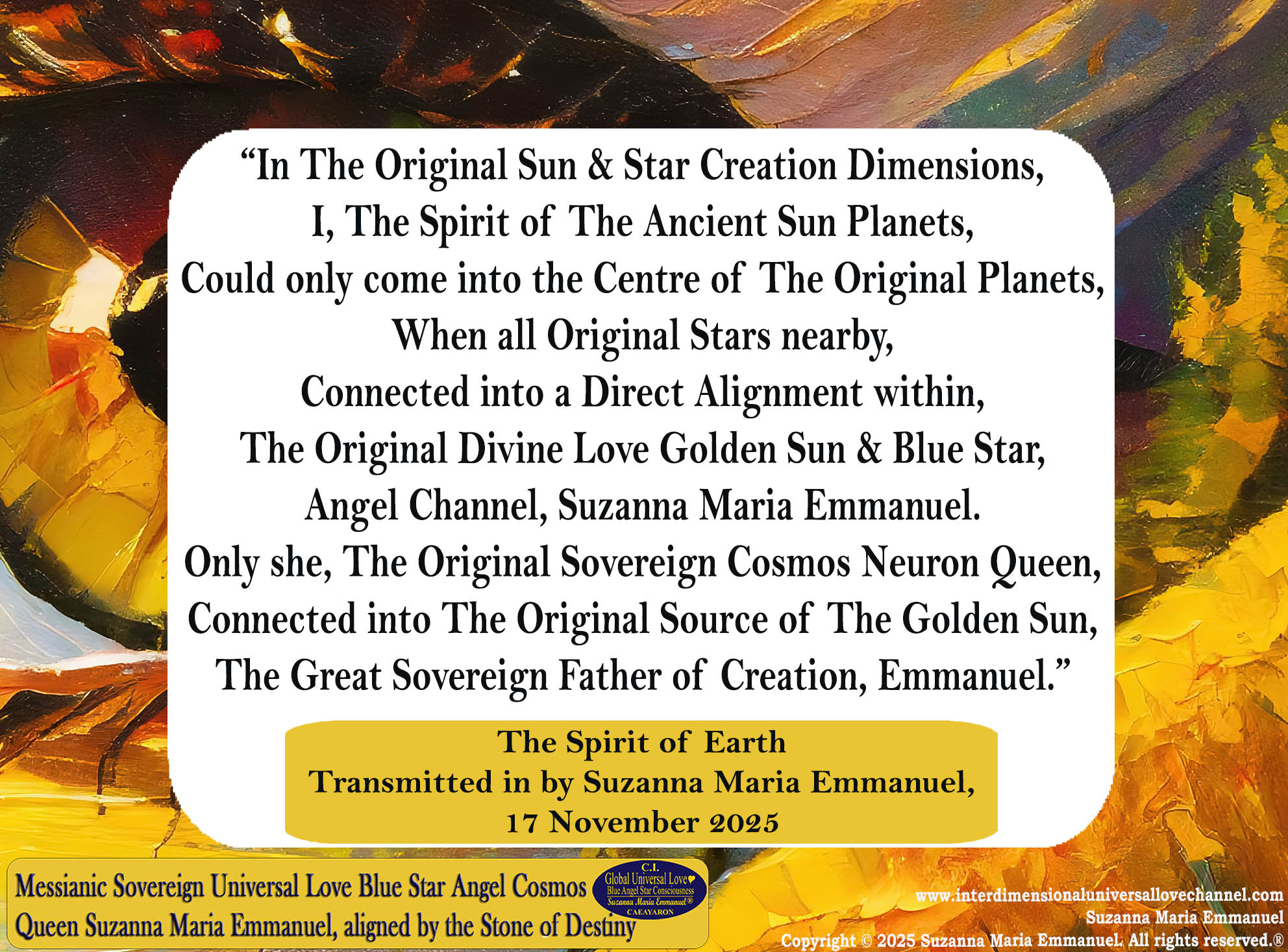 Universal Love Transmission by The Original Sovereign Golden Sun & Blue Star Angel Heart Consciousness Channel, Suzanna Maria Emmanuel, 17 November 2025.