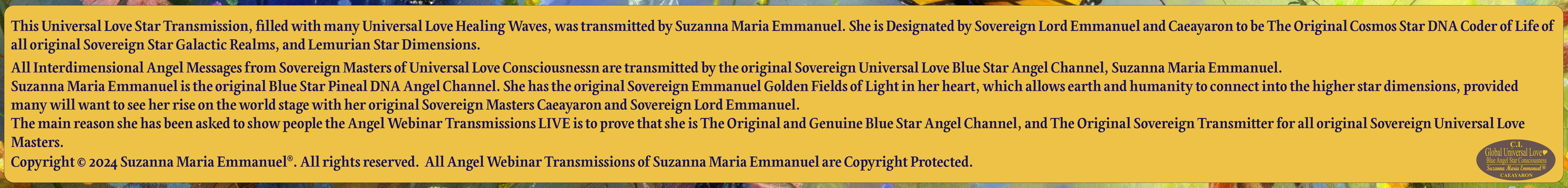 All Suzanna Maria Emmanuel's Original Universal Love Star Transmissions and The Original Universal Healing Codes connect into Sovereign Lord Emmanuel's and Caeayaron's Original Sovereign Cosmos Star Intelligence.