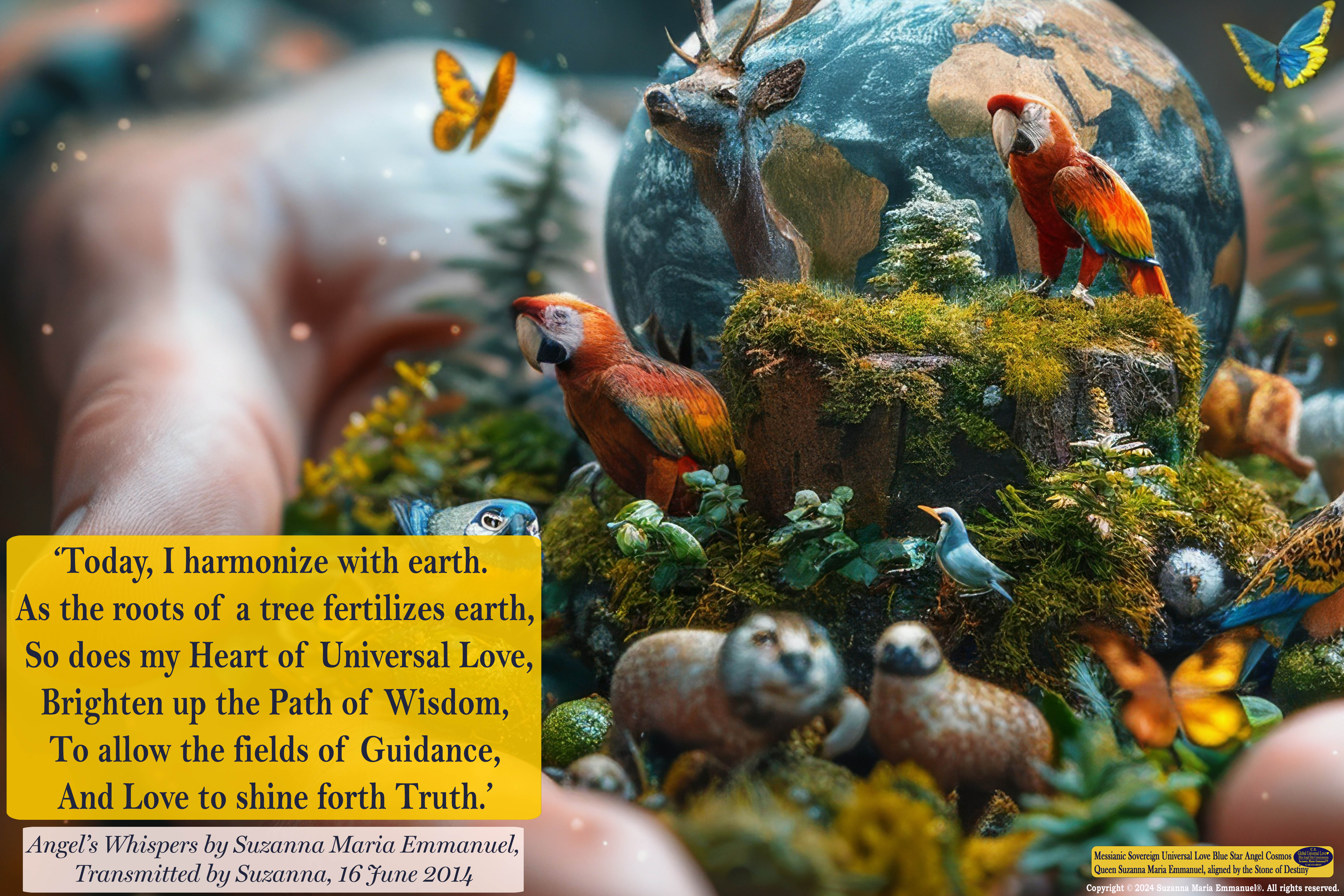 Suzanna Maria Emmanuel is The Original Designated Sovereign Universal Love Channel. In the year 2014, Sovereign Lord Emmanuel and Caeayaron told her that the future pathway of humanity on earth could only exist in the future with her Sovereign Universal Love Transmissions. All Suzanna Maria Emmanuel's Universal Love Star Consciousness Transmissions carry a DNA Code for life to continue to exist on earth. She was told by her Sovereign Masters to always stay in full alignment to The Divine Universal Love Golden Sun Consciousness of Sovereign Lord Emmanuel.