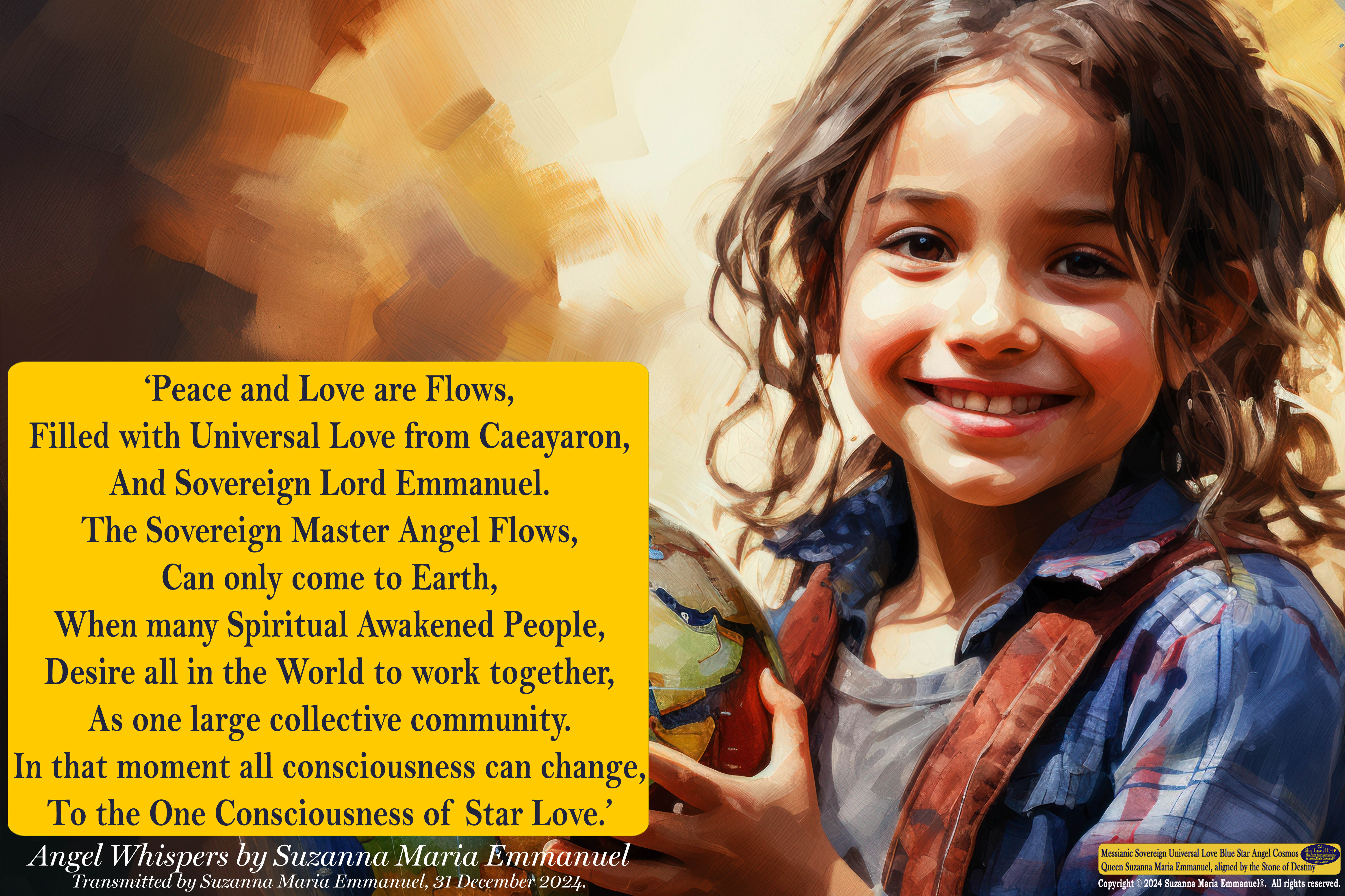 Suzanna Maria Emmanuel is The Original Designated Sovereign Universal Love Channel. In the year 2014, Sovereign Lord Emmanuel and Caeayaron told her that the future pathway of humanity on earth could only exist in the future with her Sovereign Universal Love Transmissions. All Suzanna Maria Emmanuel's Universal Love Star Consciousness Transmissions carry a DNA Code for life to continue to exist on earth. She was told by her Sovereign Masters to always stay in full alignment to The Divine Universal Love Golden Sun Consciousness of Sovereign Lord Emmanuel.