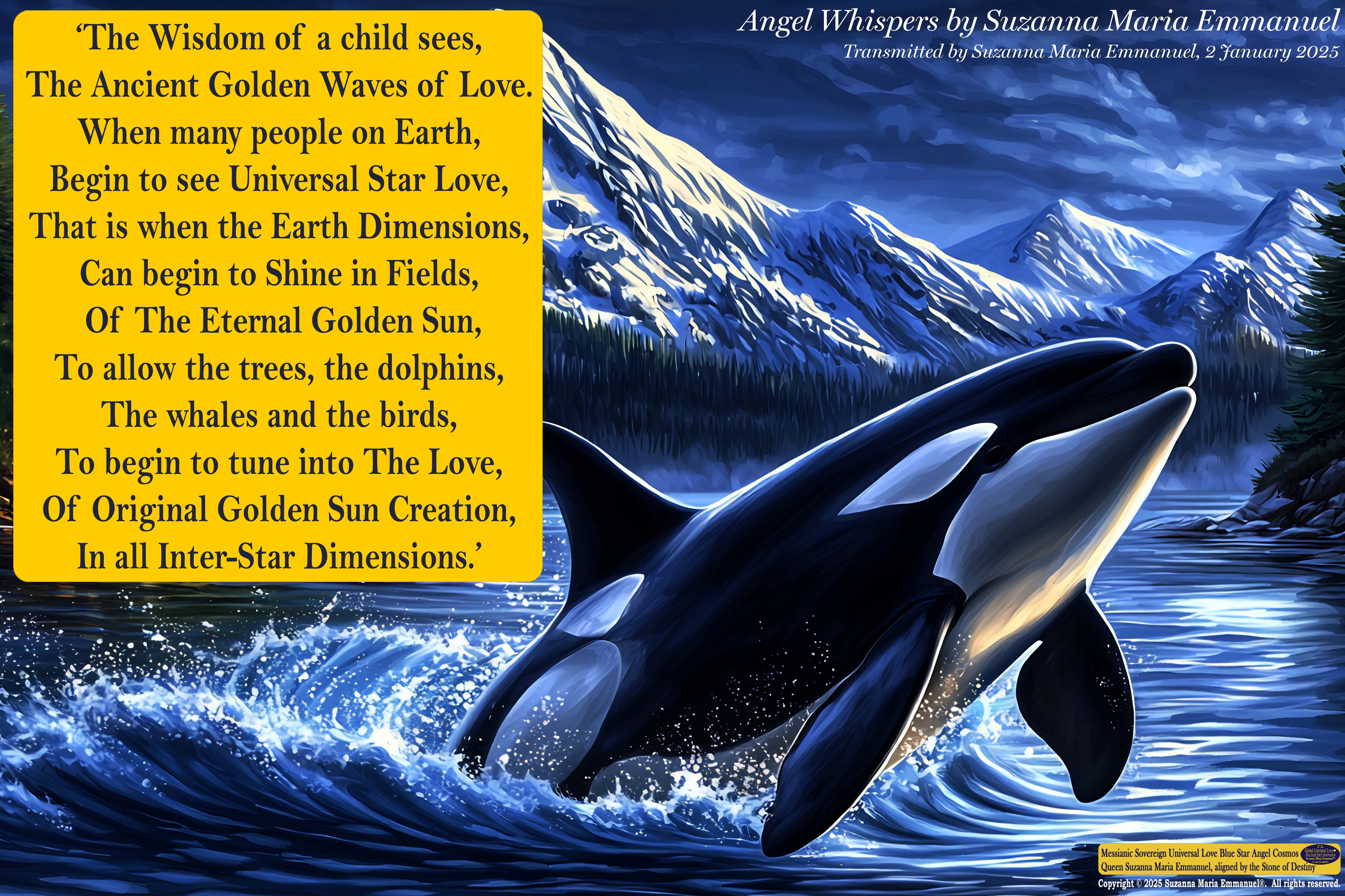 Suzanna Maria Emmanuel is The Original Designated Sovereign Universal Love Channel. In the year 2014, Sovereign Lord Emmanuel and Caeayaron told her that the future pathway of humanity on earth could only exist in the future with her Sovereign Universal Love Transmissions. All Suzanna Maria Emmanuel's Universal Love Star Consciousness Transmissions carry a DNA Code for life to continue to exist on earth. She was told by her Sovereign Masters to always stay in full alignment to The Divine Universal Love Golden Sun Consciousness of Sovereign Lord Emmanuel.