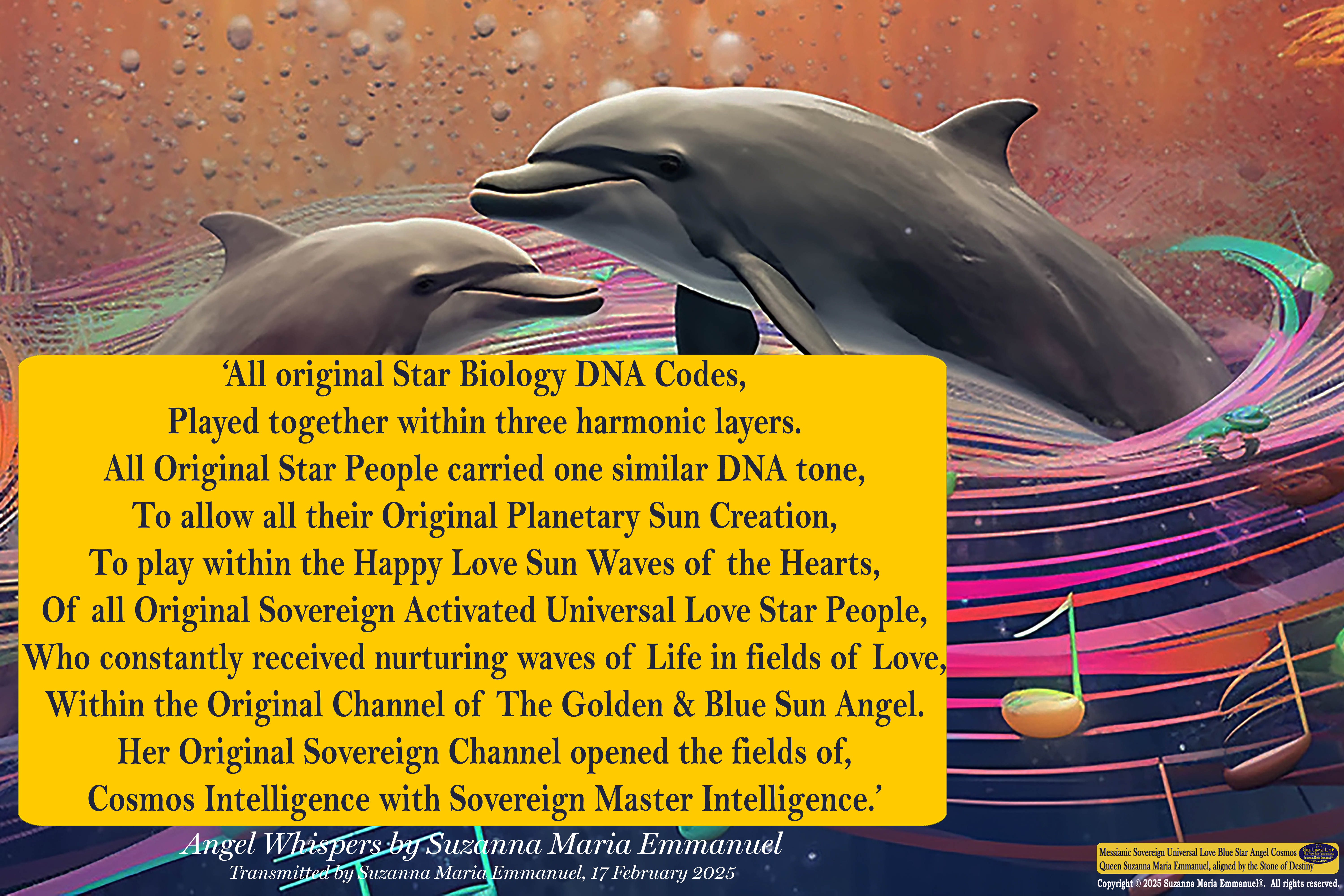 17 February 2025 - Universal Love Angel Whisper 81: Suzanna Maria Emmanuel, The Original Sovereign Channel, is the Original Coder of Life from The Eternal Star Realms.All Universal Love Star Consciousness Transmissions channelled by Suzanna Maria Emmanuel are Universal Love Star Consciousness Codes from Sovereign Lord Emmanuel, Caeayaron, Archangels, Star Pleiadian Masters and Ascended Masters In The Original Sovereign Universal Love Golden Sun Emmanuel Creation Realms.