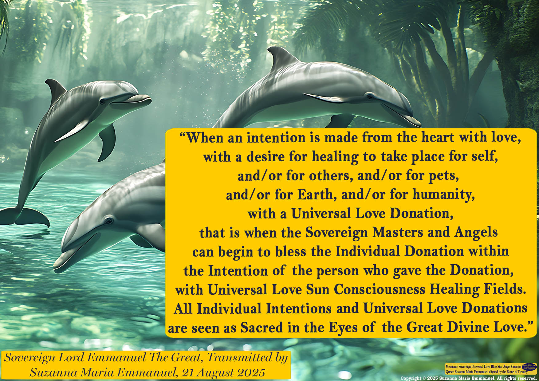 Copyright © 2025 Suzanna Maria Emmanuel®. All rights reserved. Welcome to The Universal Love Master Healing Fields from Sovereign Masters for Spiritual Healings, Guidance, Spiritual Protection, Manifestation, Spiritual Encouragement and Personal Support. Terms and Conditions apply at all times. Please see the Terms and Conditions when you come in through to the home page. www.interdimensionaluniversallovechannel.com