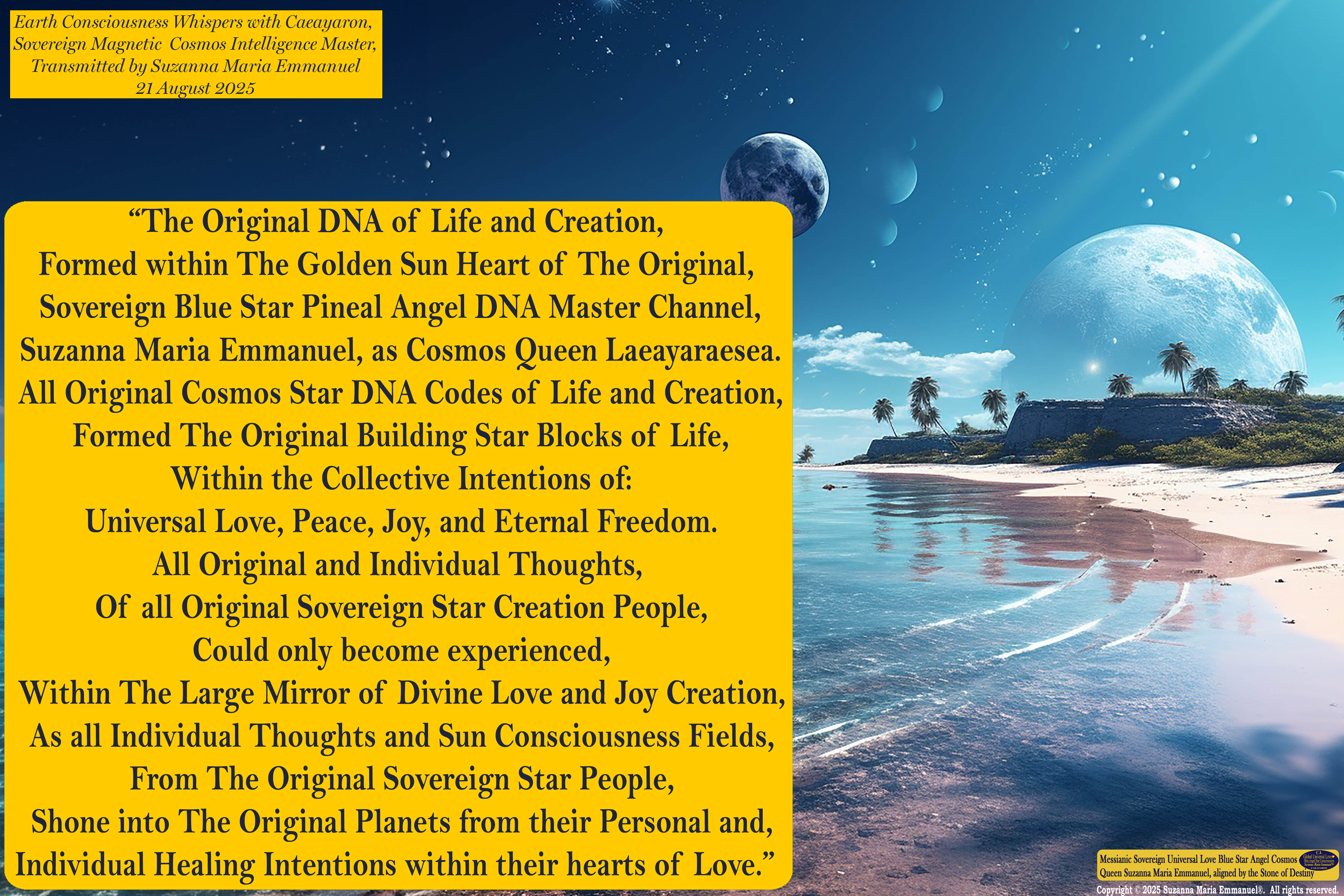 7: 21 August 2025 - Ancient Earth Biology in the Original Sovereign Cosmos Dimensions - The Original Designated Angel Channel, Suzanna Maria Emmanuel, was called by Sovereign Lord Emmanuel The Great, in late September 2009.