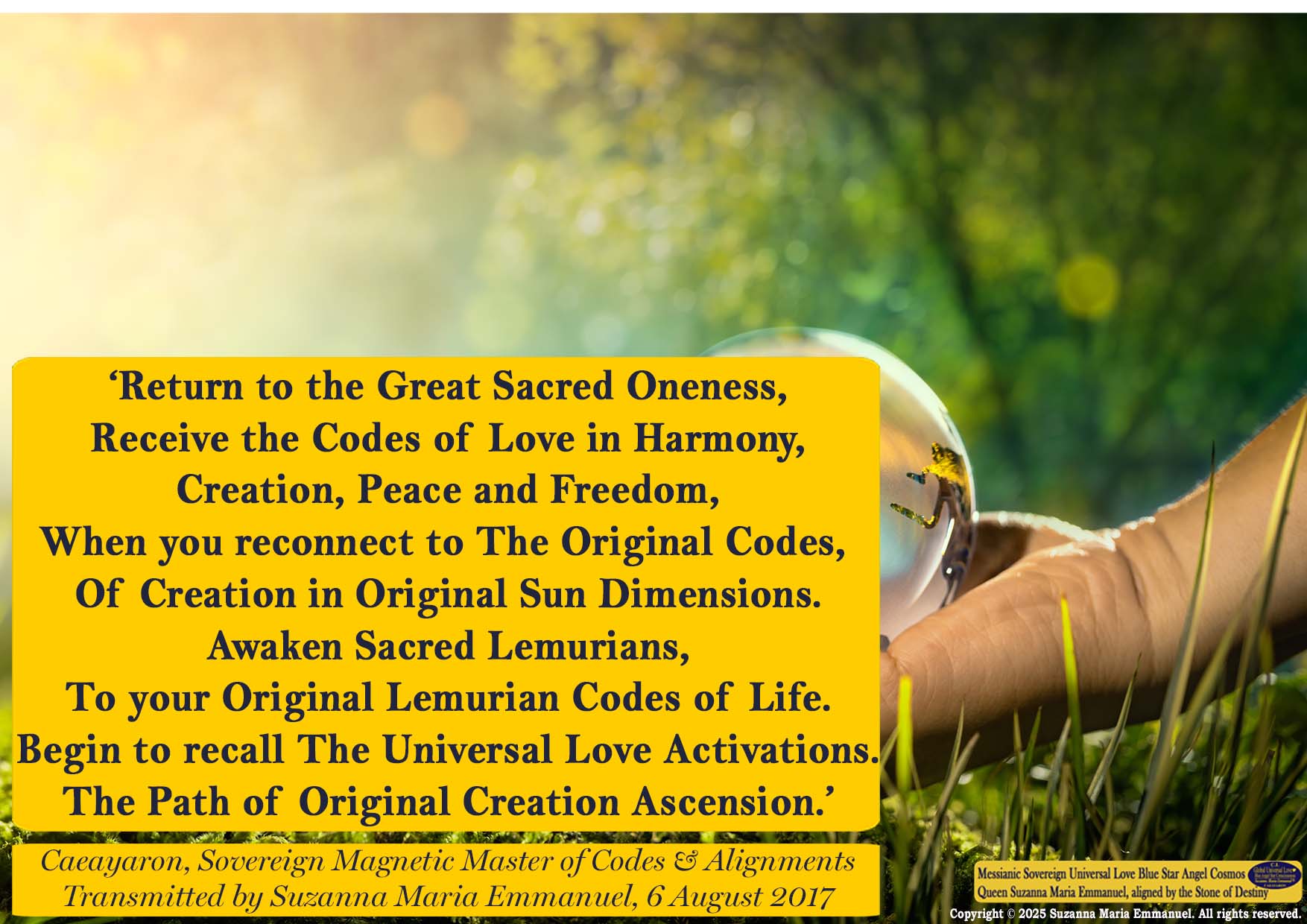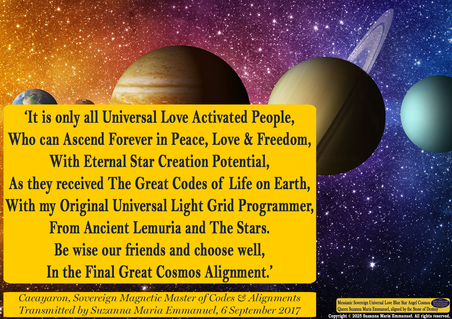 Suzanna Maria Emmanuel is Designated by Sovereign Father Emmanuel & Caeayaron, Cosmos Star DNA Creation Intelligence, as The Original Sovereign Universal Love Angel Channel to open up the Original Messianic Gateway of Eternal Love.