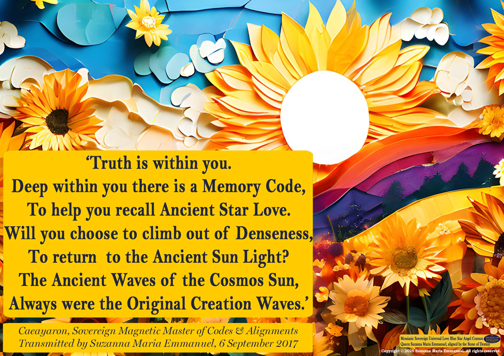 All Sovereign Cosmos Intellect is Transmitted by Suzanna Maria Emmanuel and is copyright protected. Copyright © 2025 Suzanna Maria Emmanuel®. All rights reserved.