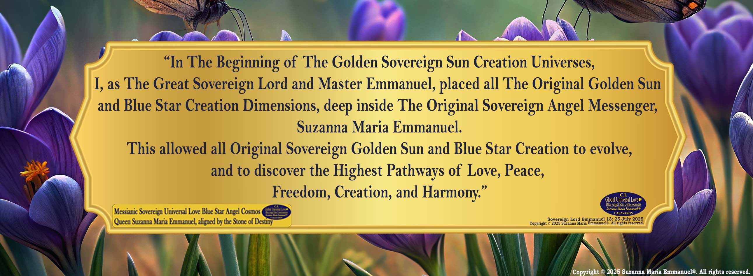 13: 25 July 2025 - Sovereign Lord Emmanuel's Transmission: The Original Designated Angel Channel, Suzanna Maria Emmanuel, was called by Sovereign Lord Emmanuel The Great, in late September 2009.