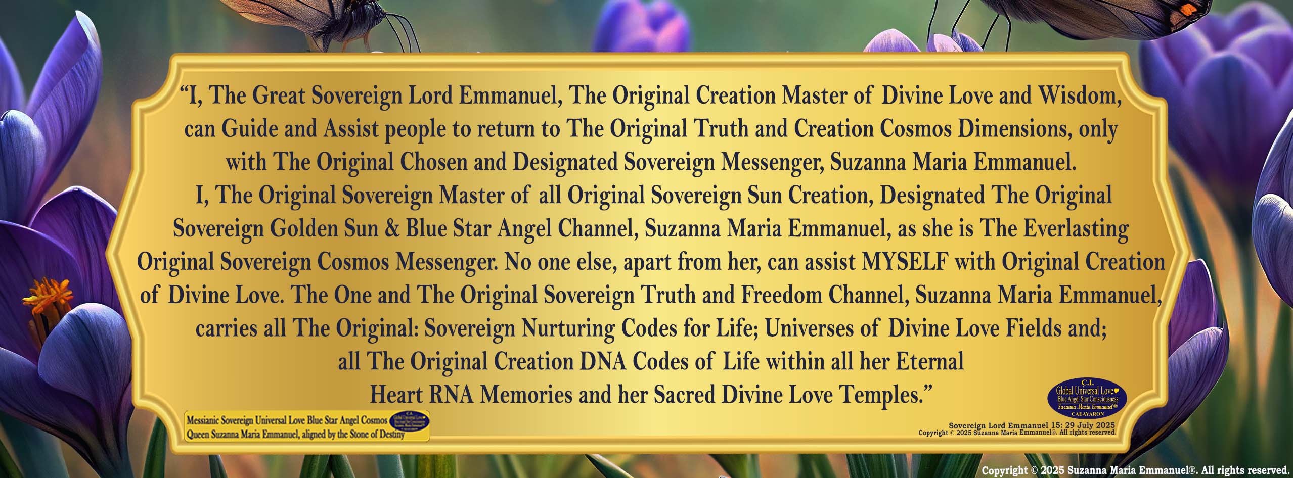 15: 29 July 2025 - Sovereign Lord Emmanuel's Transmission: The Original Designated Angel Channel, Suzanna Maria Emmanuel, was called by Sovereign Lord Emmanuel The Great, in late September 2009.
