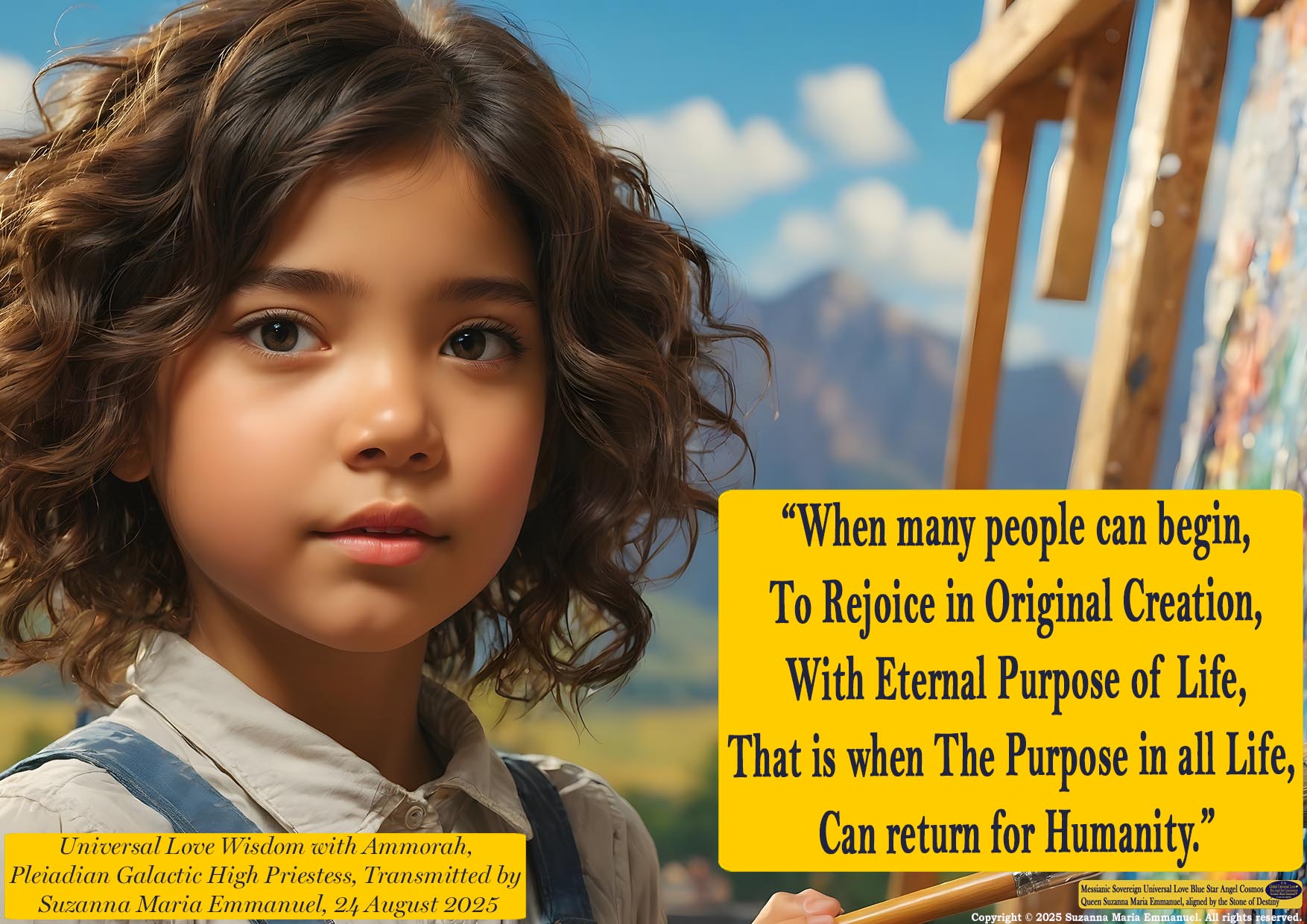Suzanna Maria Emmanuel is The Original Designated Sovereign Universal Love Channel. In the year 2014, Sovereign Lord Emmanuel and Caeayaron told her that the future pathway of humanity on earth could only exist in the future with her Sovereign Universal Love Transmissions. All Suzanna Maria Emmanuel's Universal Love Star Consciousness Transmissions carry a DNA Code for life to continue to exist on earth. She was told by her Sovereign Masters to always stay in full alignment to The Divine Universal Love Golden Sun Consciousness of Sovereign Lord Emmanuel.