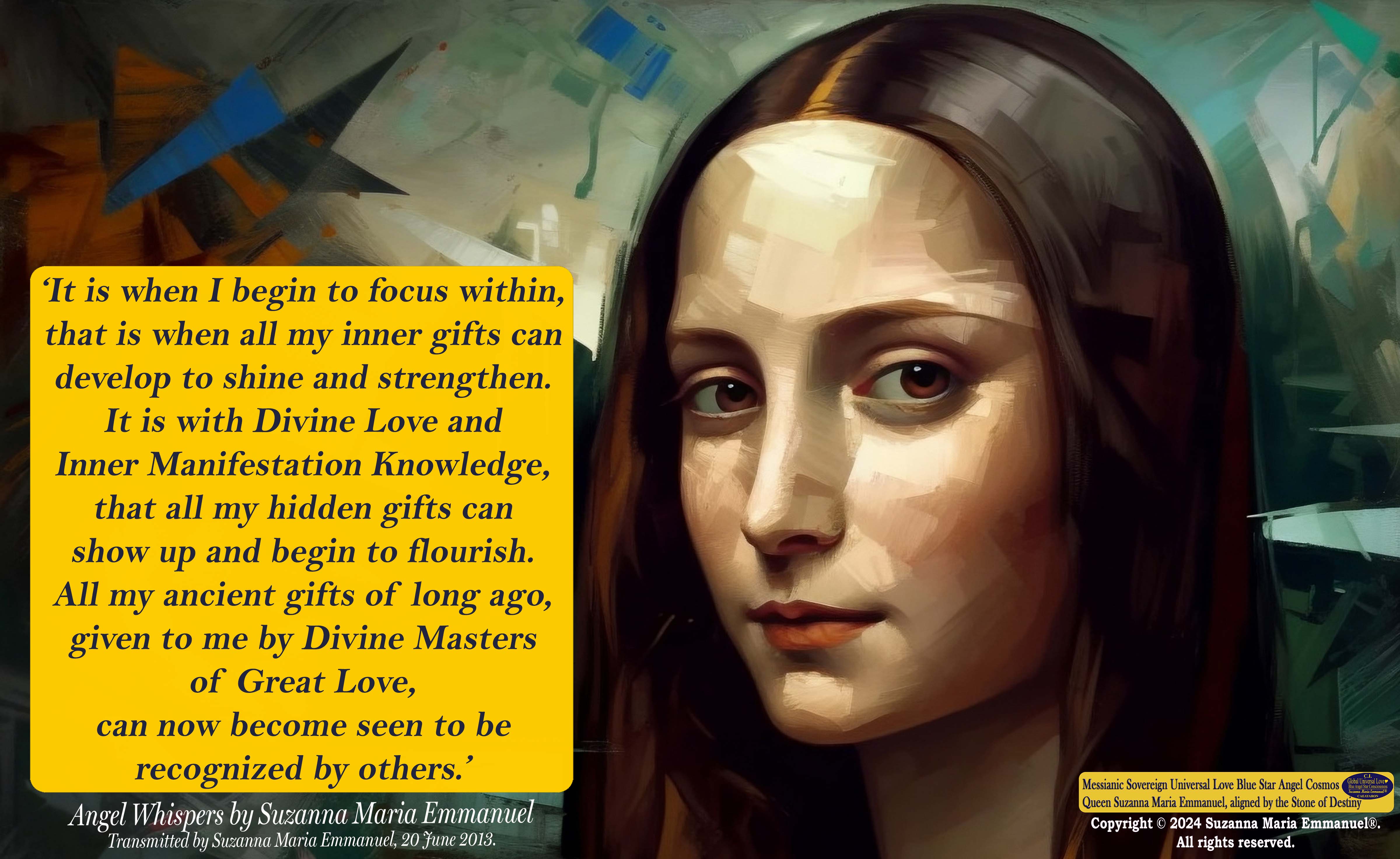 Suzanna Maria Emmanuel is The Original Designated Sovereign Universal Love Channel. In the year 2014, Sovereign Lord Emmanuel and Caeayaron told her that the future pathway of humanity on earth could only exist in the future with her Sovereign Universal Love Transmissions. All Suzanna Maria Emmanuel's Universal Love Star Consciousness Transmissions carry a DNA Code for life to continue to exist on earth. She was told by her Sovereign Masters to always stay in full alignment to The Divine Universal Love Golden Sun Consciousness of Sovereign Lord Emmanuel.