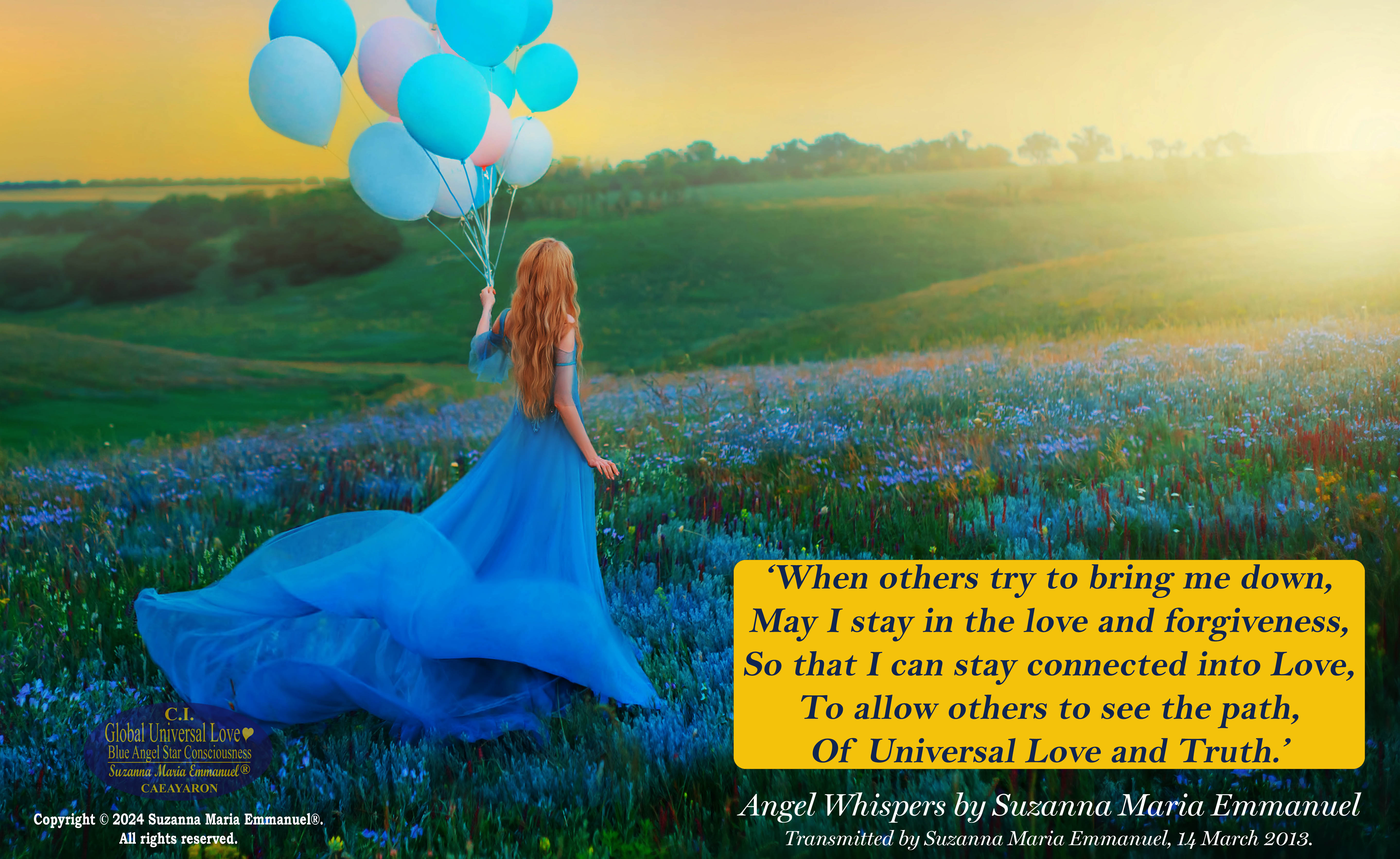 Suzanna Maria Emmanuel is The Original Designated Sovereign Universal Love Channel. In the year 2014, Sovereign Lord Emmanuel and Caeayaron told her that the future pathway of humanity on earth could only exist in the future with her Sovereign Universal Love Transmissions. All Suzanna Maria Emmanuel's Universal Love Star Consciousness Transmissions carry a DNA Code for life to continue to exist on earth. She was told by her Sovereign Masters to always stay in full alignment to The Divine Universal Love Golden Sun Consciousness of Sovereign Lord Emmanuel.