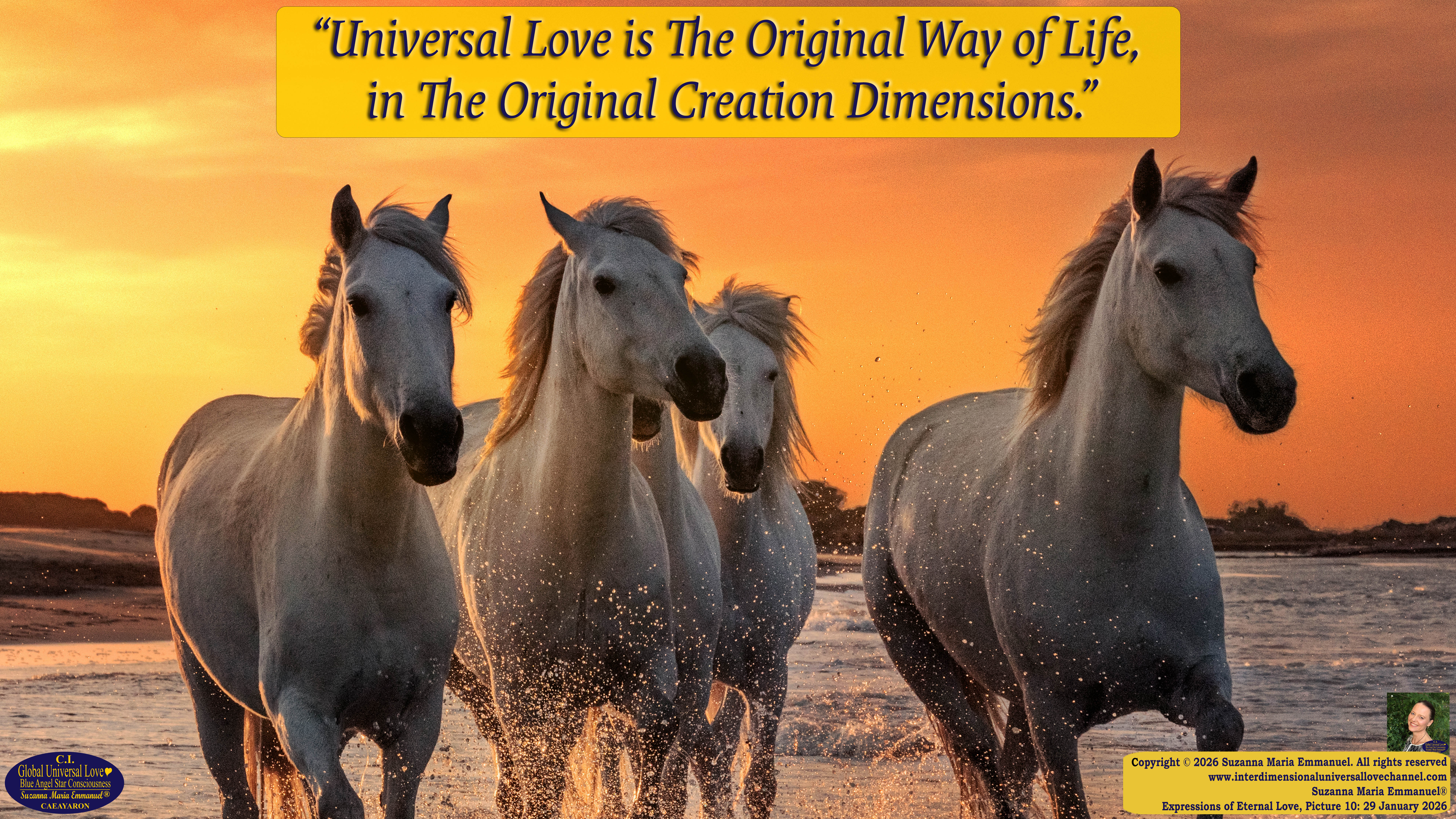 “When all Original Sovereign Star Creation was balanced in The Great Pineal DNA Love within The Original Golden Sun Archangel, Laeayaraesea, I, as Sovereign Lord Emmanuel The Great, said to her: ‘Go and see, if there is any Good in Creation’. I, as Sovereign Lord Emmanuel The Great, brought her into Earth, today, and I ask her the question: ‘What do you see, Dear Suzanna? Are there genuine People who desire Peace?’ And that is why she continues, every day, to channel in New Messages, to give Mankind some time to Awaken.”