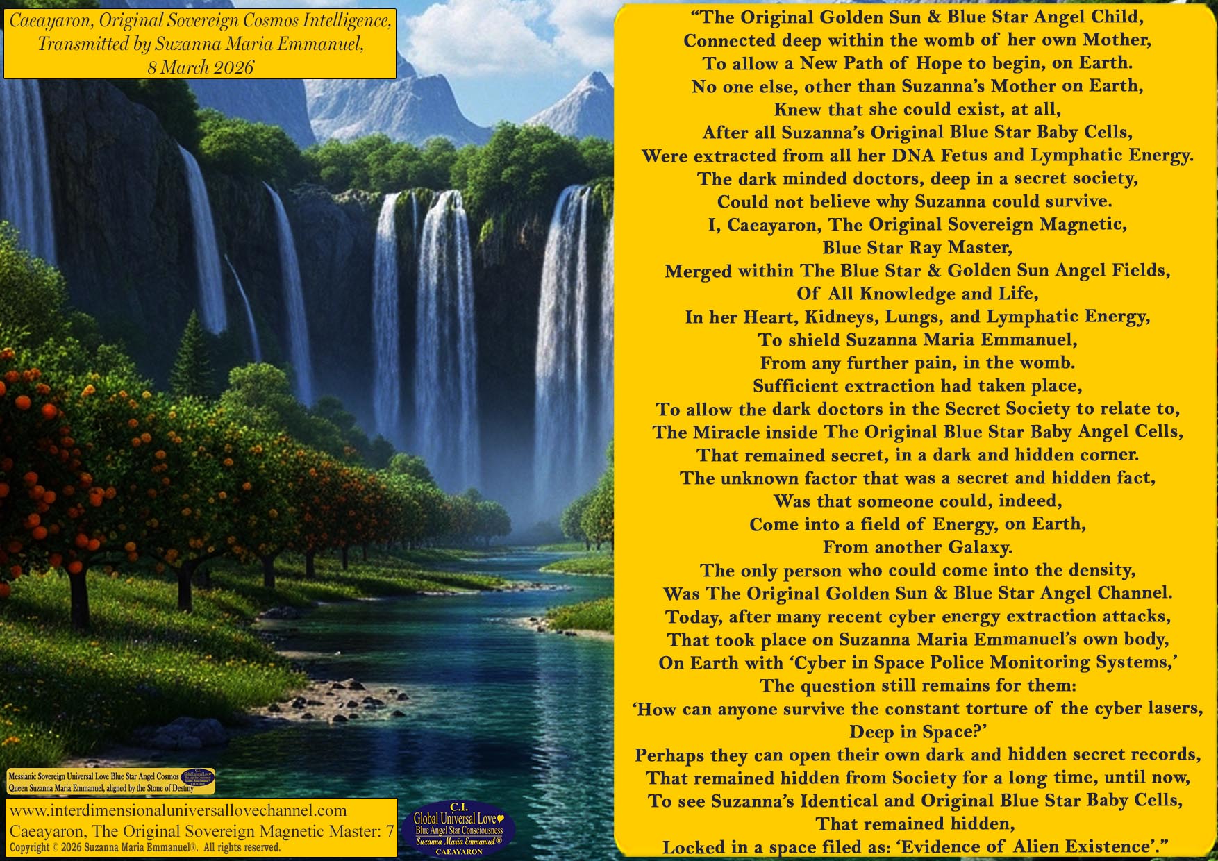 “The Original Golden Sun & Blue Star Angel Child, connected deep within the womb of her own Mother, to allow a New Path of Hope to begin on Earth. No one else, other than Suzanna’s Mother on Earth, knew that she could exist at all, after all Suzanna’s Original Blue Star Baby Cells were extracted from all her DNA Fetus and Lymphatic Energy. The dark minded doctors, deep in a secret society, could not believe why Suzanna could survive. I, Caeayaron, The Original Sovereign Magnetic Blue Star Ray Master, merged within The Blue Star & Golden Sun Angel Fields of All Knowledge and Life, in her Heart, Kidneys, Lungs, and Lymphatic Energy, to shield Suzanna Maria Emmanuel, from any further pain in the womb. Sufficient extraction had taken place, to allow the dark doctors in the Secret Society to relate to The Miracle inside of The Original Blue Star Baby Angel Cells that remained secret, in a dark and hidden corner. The unknown factor that was a secret and hidden fact, was that someone could indeed, come into a field of Energy on Earth, from another Galaxy. The only person who could come into the density was The Original Golden Sun & Blue Star Angel Channel. Today, after many recent cyber energy extraction attacks that took place on Suzanna Maria Emmanuel’s own body on Earth, with ‘Cyber in Space Police Monitoring Systems,’ the question still remains for them: ‘How can anyone survive the constant torture of the cyber lasers, deep in Space?’ Perhaps they can open their own dark and hidden secret records, that remained hidden from Society for a long time, until now, to see Suzanna’s Identical and Original Blue Star Baby Cells that remained hidden, locked in a space filed as: ‘Evidence of Alien Existence’.” 💙