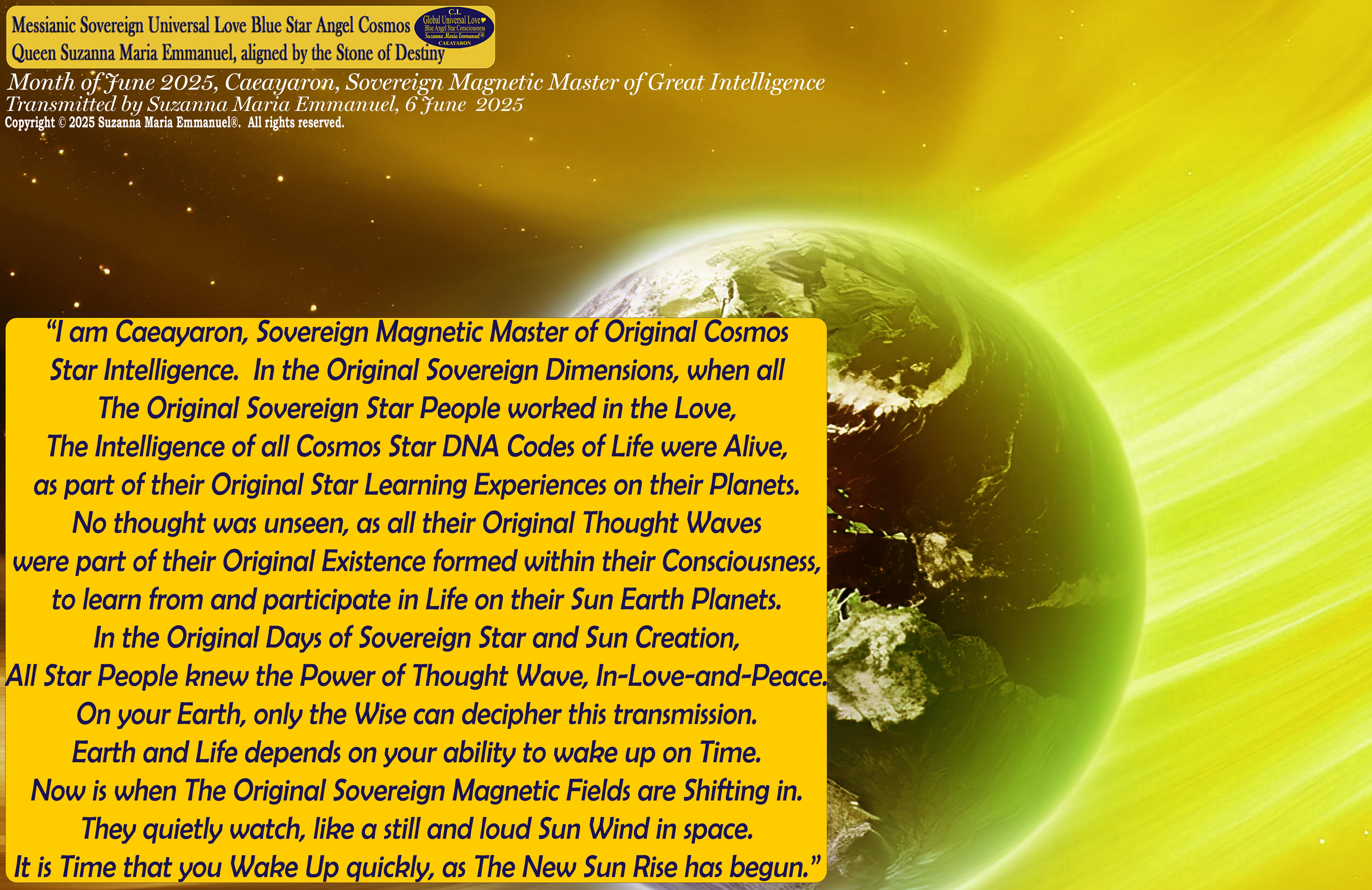 Caeayaron, Sovereign Magnetic Master of all Original Creation and Sovereign Codes and Cosmos Alignments, in The Original Sovereign Universal Love Creation Universes, Transmitted by Suzanna Maria Emmanuel, 6 June 2025.