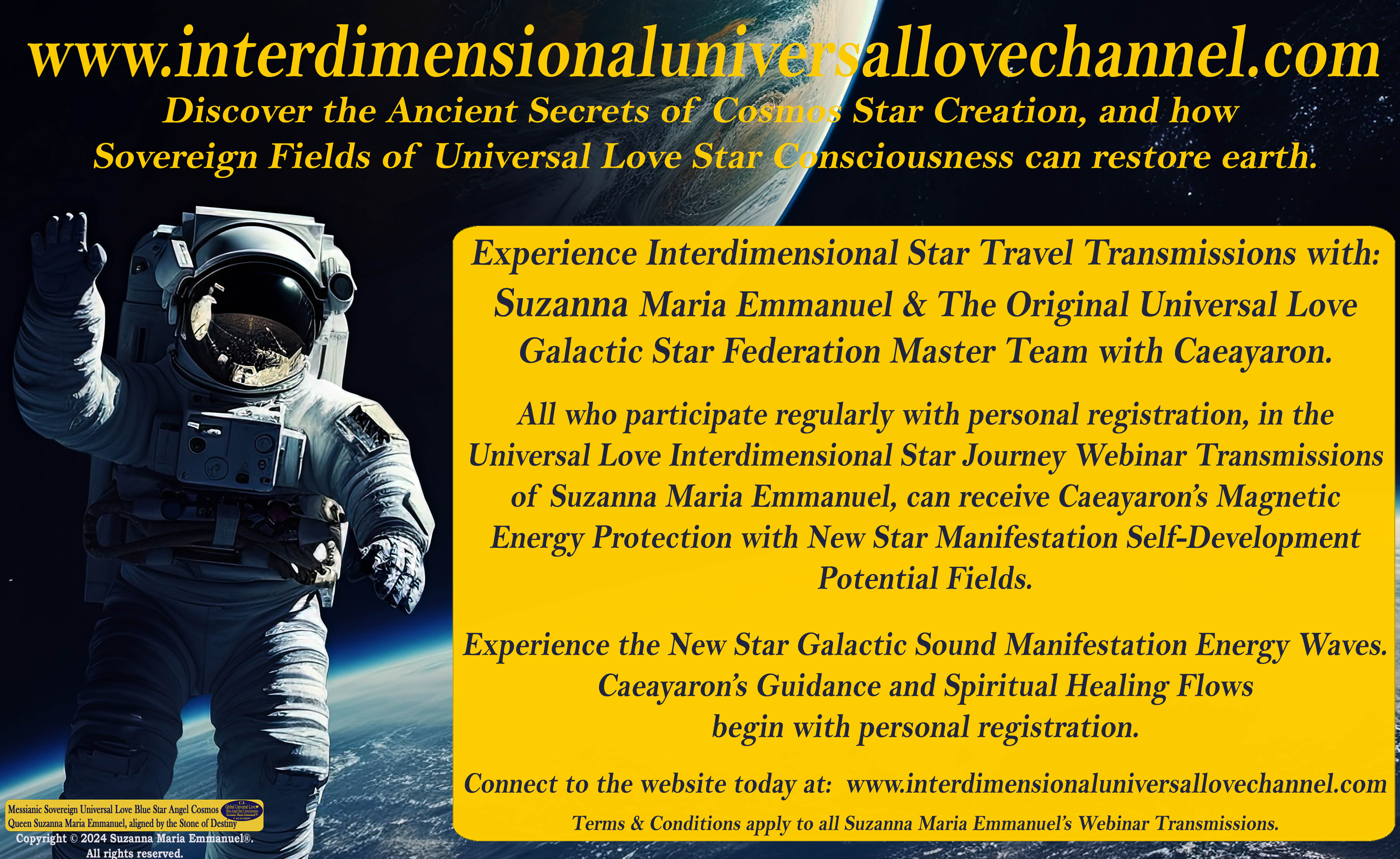 Copyright © 2025 Suzanna Maria Emmanuel®. All rights reserved. All Suzanna Maria Emmanuel's Interdimensional Star Intellect Transmissions of Universal Love Star Consciousness carry a professional and Legal Disclaimer & Indemnity, Trademark, and Copyright Protection Clause.