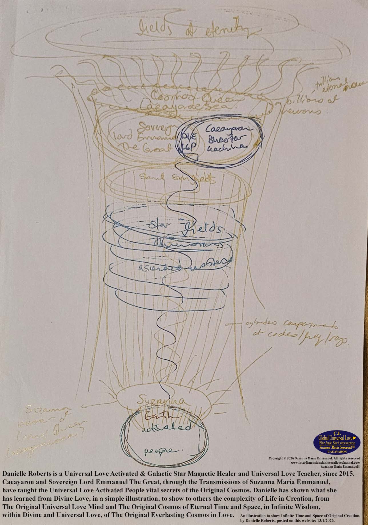 In this recent webinar, we had on the 10th of January 2026, Caeayaron explained how Cosmos Queen Laeayaraesea with her Queen Neuron RNA/DNA fields, exists in future dimensions, outside of the Milky Way galaxy. Her channel with Sovereign Lord Emmanuel's Golden Sun Creation Love Power RNA fields send codes, with Caeayaron’s Blue Star DNA Creation Life and Cosmos Intelligence fields also send codes, through to the mirror image self of Laeayaraesea who is Suzanna Maria Emmanuel, Universal Light Grid Programmer, who is able to create and harmonise life DNA fields of the future time line frequencies for the planet and all of life here. This I understand she has done for millions of lifetimes to allow us to reach this level of intelligence today, enough intelligence to choose for love or not. Now the life-giving DNA fields that are coming through are to help all who come to the webinars to receive greater life force energy to harmonise with the higher Universal Star Love frequencies of the new dimensions and to be protected from the cyber laser beams that are plaguing the Earth and Humanity. This allows more “time” for future activations to come so that a New Dimension of Love and Peace can become one with the planet and all of the people.
