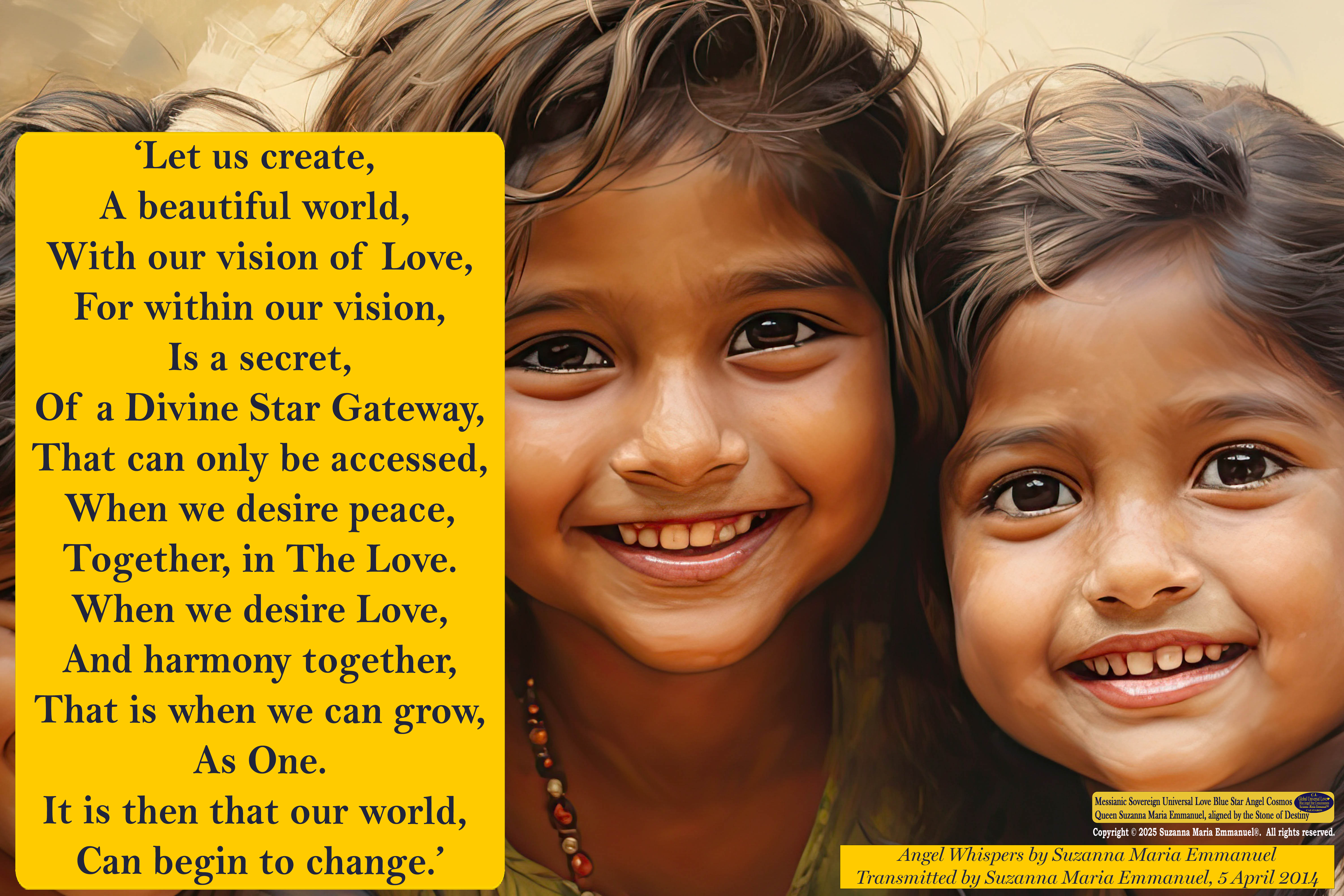Namaste, many Greetings and Warm Eternal Universal Love Healing Hugs, my name is Suzanna Maria Emmanuel. I am designated by Sovereign Lord Emmanuel and Caeayaron, to be their Original Sovereign Universal Love Golden Sun & Blue Star Angel Pineal Channel Messenger, to show people the Original Purpose of Sovereign Sun Creation and how a new path to Lasting Peace and Spiritual Love for Earth and humanity could begin.