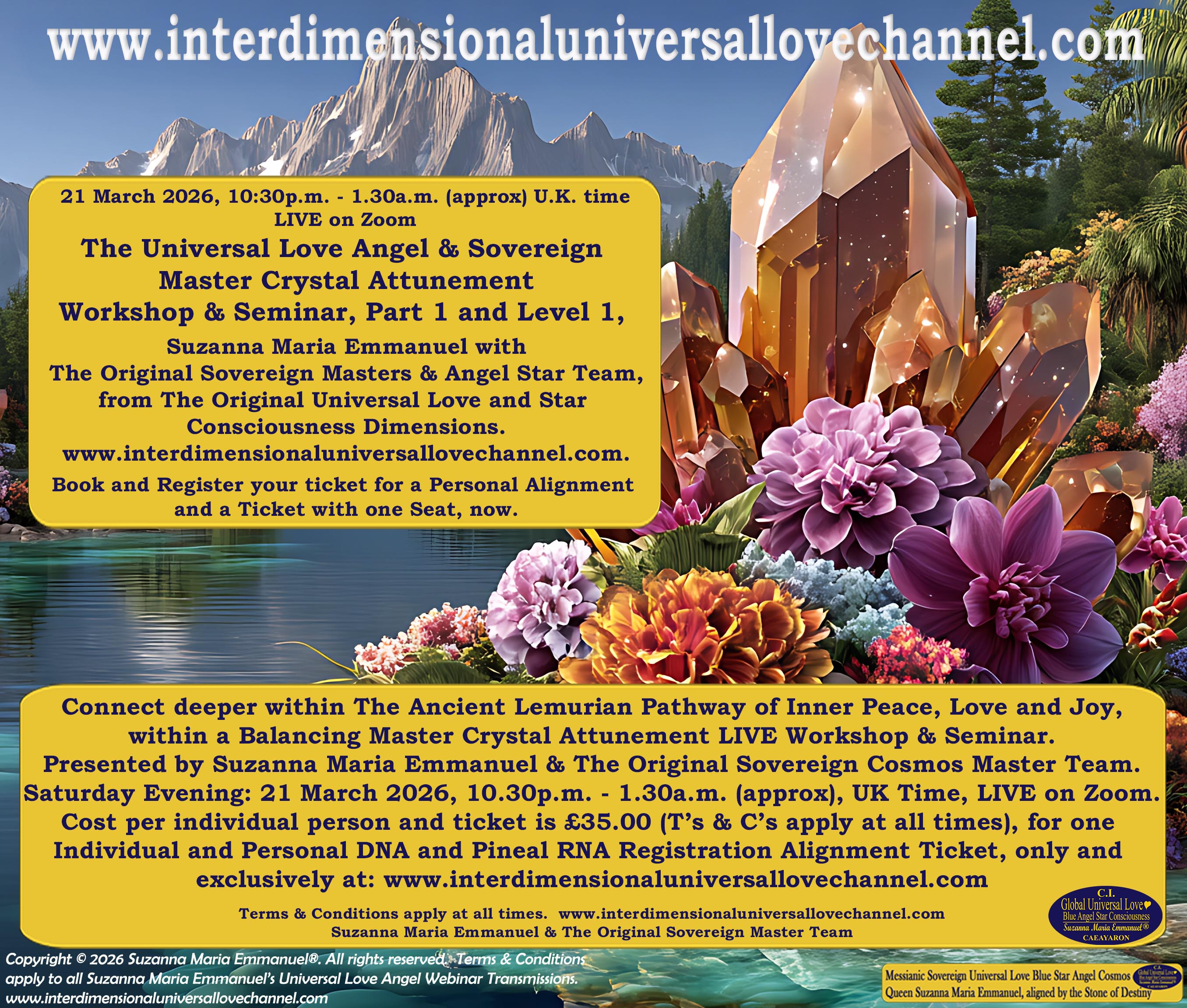 Terms & Conditions apply to all Sovereign Universal Love Angel Webinar Transmissions of Suzanna Maria Emmanuel. All Suzanna Maria Emmanuel's transmissions carry full trademark and copyright protection. All her work carries a full Disclaimer & Indemnity clause. Copyright © 2026 Suzanna Maria Emmanuel®. All rights reserved. Terms & Conditions apply at all times.