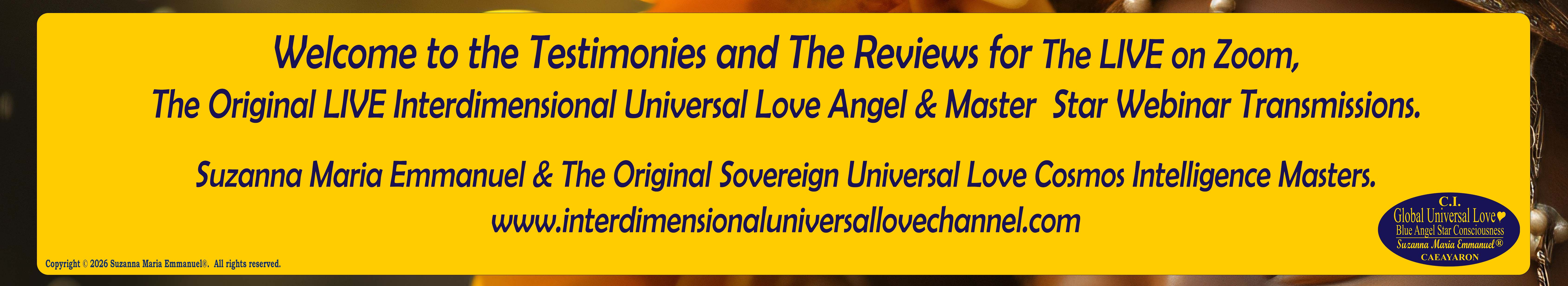 All Suzanna Maria Emmanuel's Original Star Intellect Transmissions of Universal Love Star Consciousness are trademarked and they all are copyright protected with a Professional Legal Disclaimer & Indemnity, Copyright Protection, Terms & Conditions and Trademark Clause. Suzanna Maria Emmanuel®