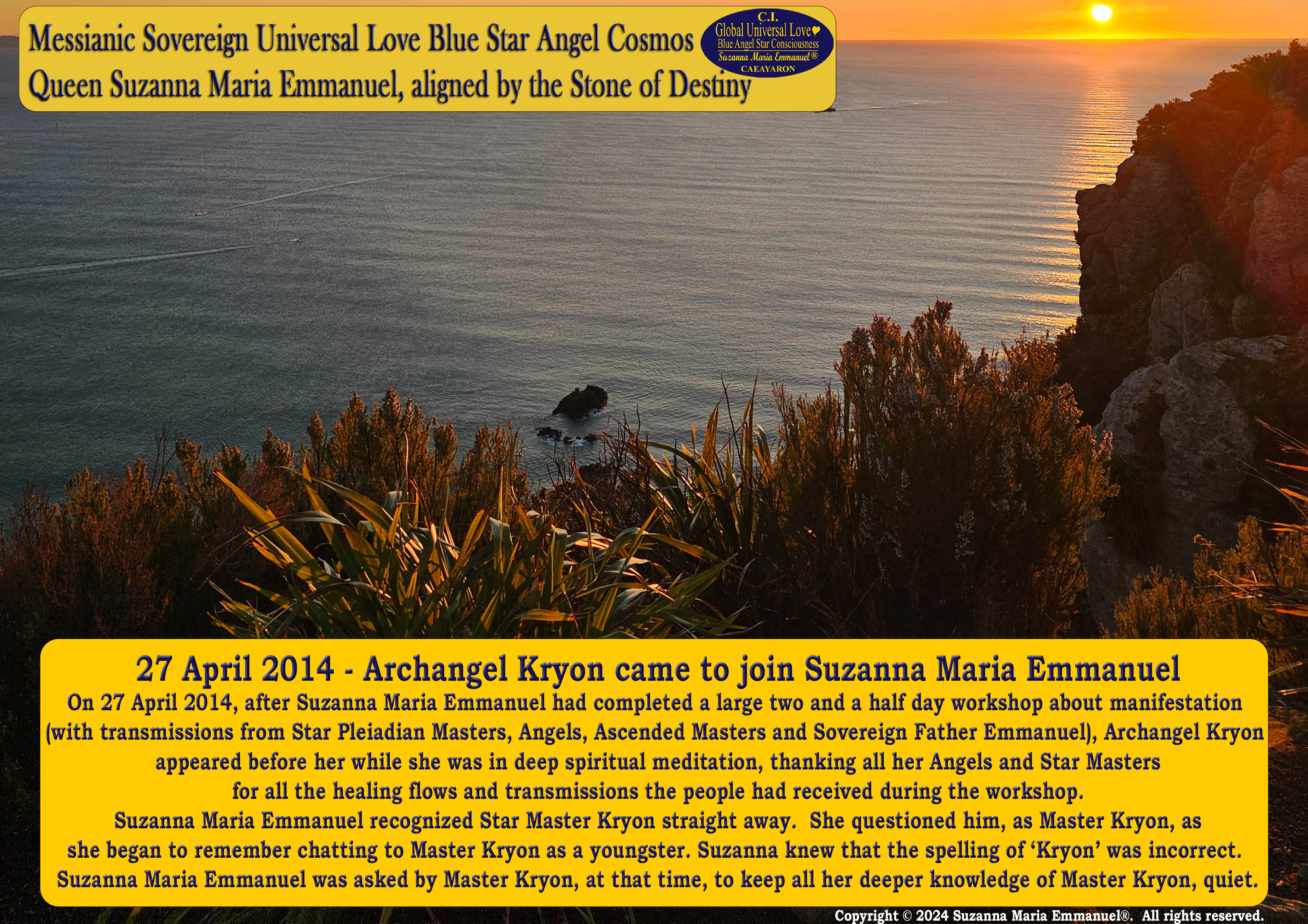 In the year 2014, Archangel Master Guide Kryon approached Suzanna Maria Emmanuel. Master Kryon asked Suzanna Maria Emmanuel if he could start to work with her Ancient Lemurian Light and Sovereign Universal Love Angel Channel. When Master Kryon reappeared to her, after her original early child hood awakening experiences, she knew that the name Kryon was incorrect. When Archangel Kryon revealed his true name in public, during a large transmission (in front of a group of people), Caeayaron began to reveal The True Purpose of The Original Sovereign Emmanuel Angel Channel of Universal Star Love Consciousness, Suzanna Maria Emmanuel in Lemuria.
