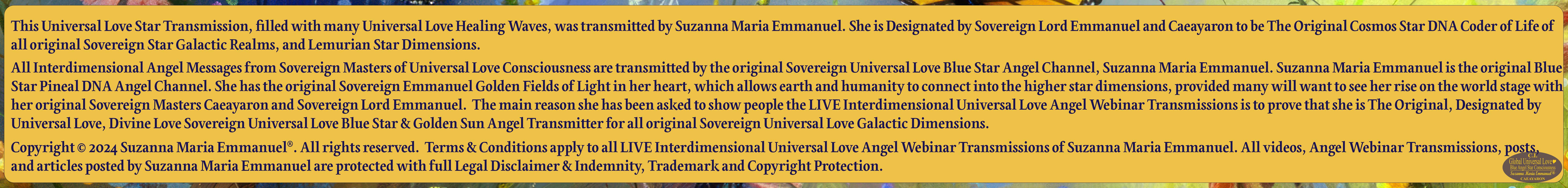 All Suzanna Maria Emmanuel's Interdimensional Star Intellect Transmissions of Universal Love Star Consciousness carries a professional and Legal Disclaimer & Indemnity, Trademark, and Copyright Protection.
