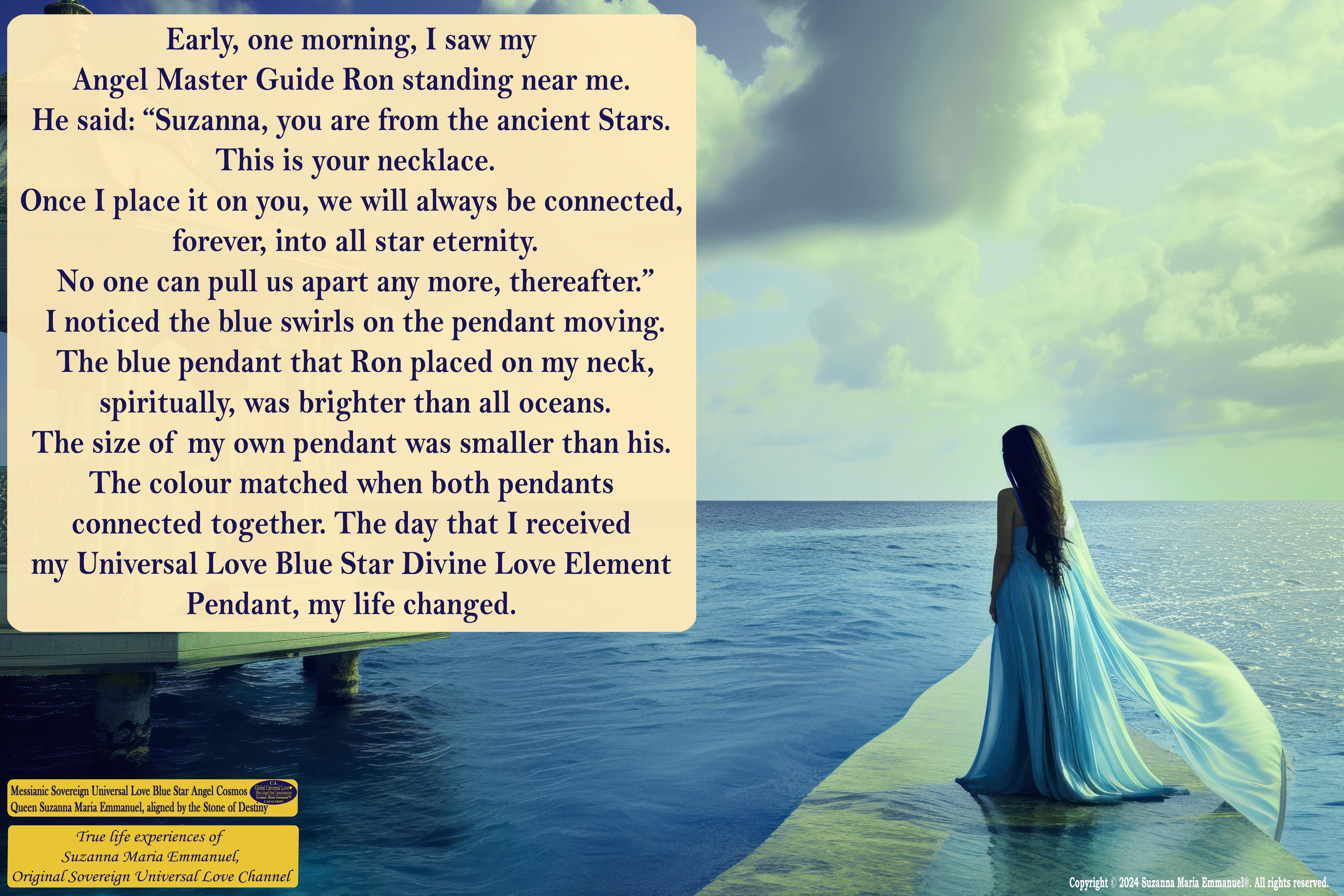 In the year 2014, she gained deeper insight of the importance of her pendant that she received from Angel Master Ron. She knew that her blue pendant connected into all time, space, and knowledge.