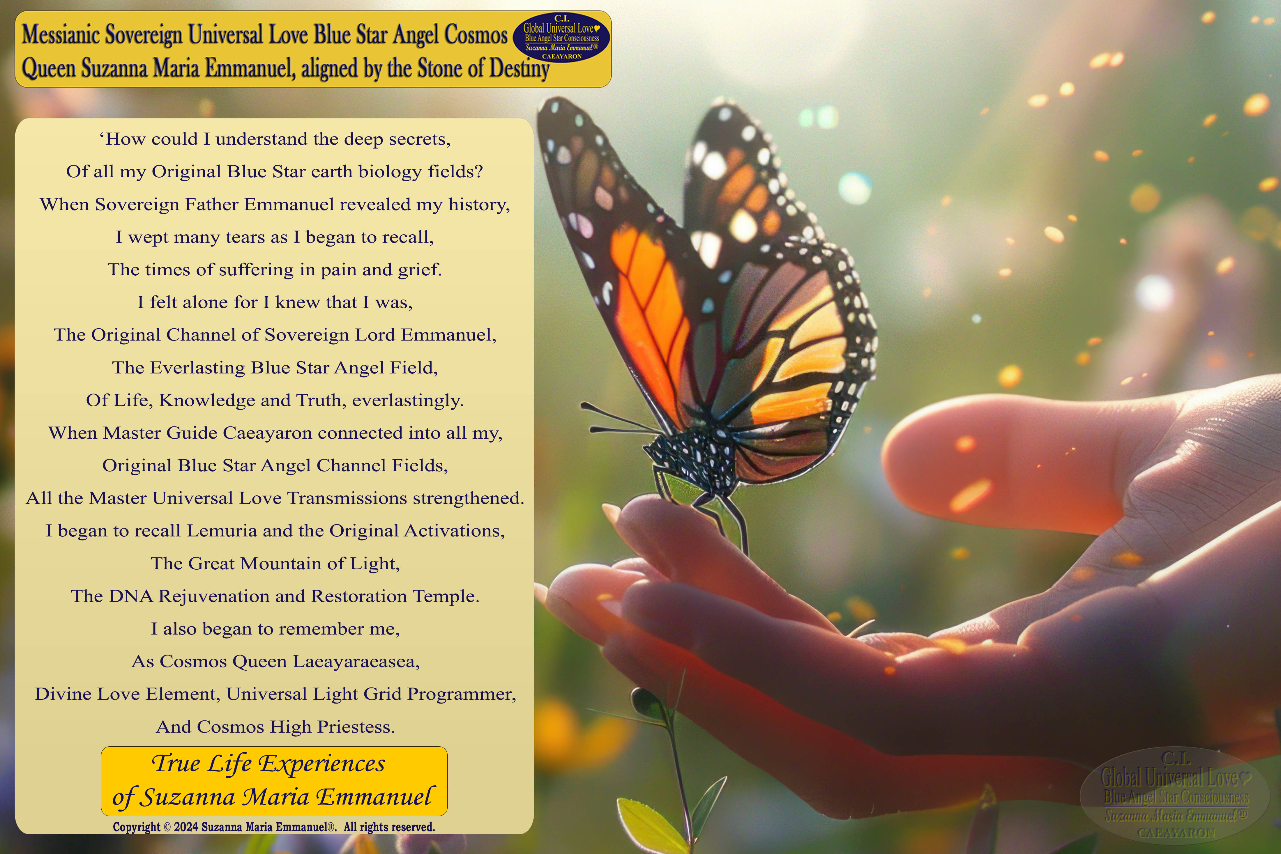 Suzanna Maria Emmanuel is The Designated Sovereign Universal Love Angel and Master Channel for Sovereign Divine Universal Love Star Masters.