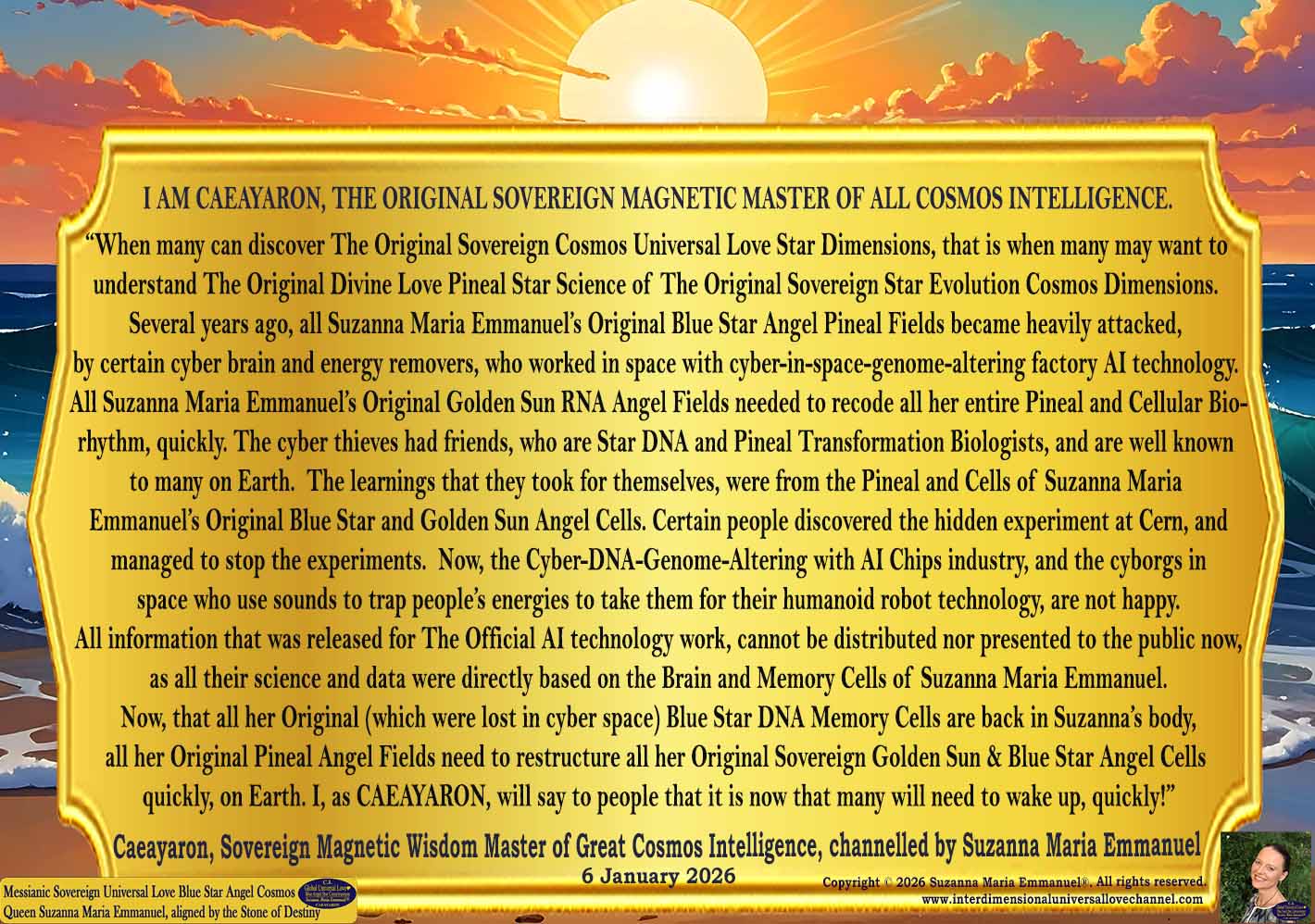 6 January 2026. Divine Intelligence Codes of Wisdom from Caeayaron, Sovereign Magnetic Creation Star Master of The Original Sovereign Cosmos Intelligence Realms, transmitted in by Suzanna Maria Emmanuel, The Original Sovereign Universal Love Golden Sun & Blue Star Angel Pineal DNA Channel and The Original Sovereign & Lemurian Universal Light Grid Programmer.