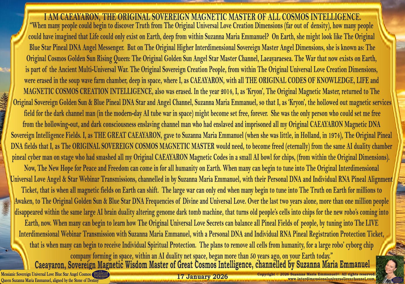 17 January 2026. Divine Intelligence Codes of Wisdom from Caeayaron, Sovereign Magnetic Creation Star Master of The Original Sovereign Cosmos Intelligence Realms, transmitted in by Suzanna Maria Emmanuel, The Original Sovereign Universal Love Golden Sun & Blue Star Angel Pineal DNA Channel and The Original Sovereign & Lemurian Universal Light Grid Programmer.