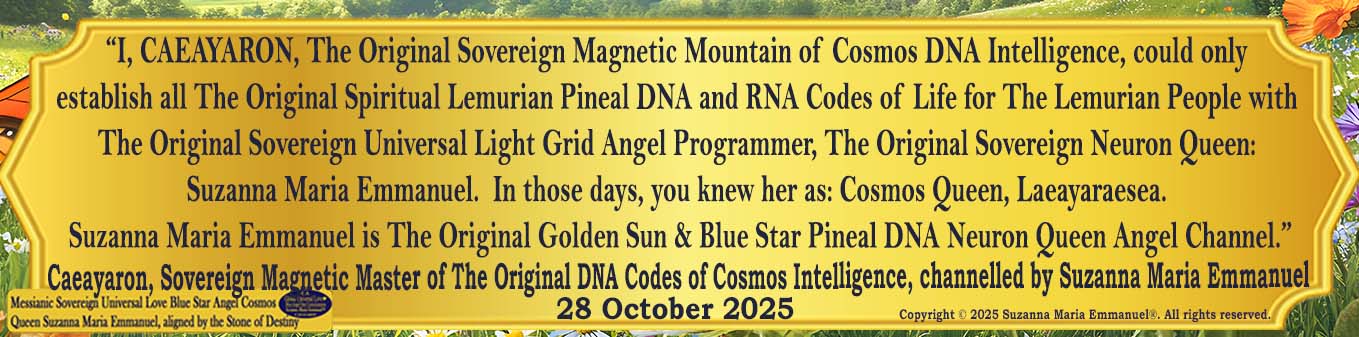 Suzanna Maria Emmanuel is The Original Sovereign Universal Love Golden Sun & Blue Star Angel Pineal DNA Transmission Channel for Sovereign Lord Emmanuel The Great & Caeayaron, The Original Sovereign Master of Magnetic Cosmos Intelligence in The Original Sovereign Universal Love Star Creation Dimensions.