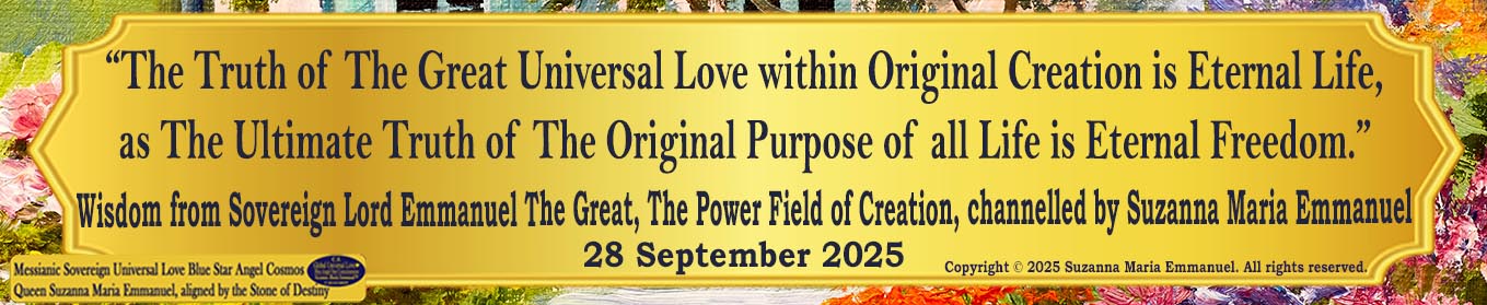 Suzanna Maria Emmanuel is The Original Sovereign Universal Love Golden Sun & Blue Star Angel Pineal DNA Transmission Channel for Sovereign Lord Emmanuel The Great & Caeayaron, Sovereign Master of Magnetic Cosmos Intelligence.