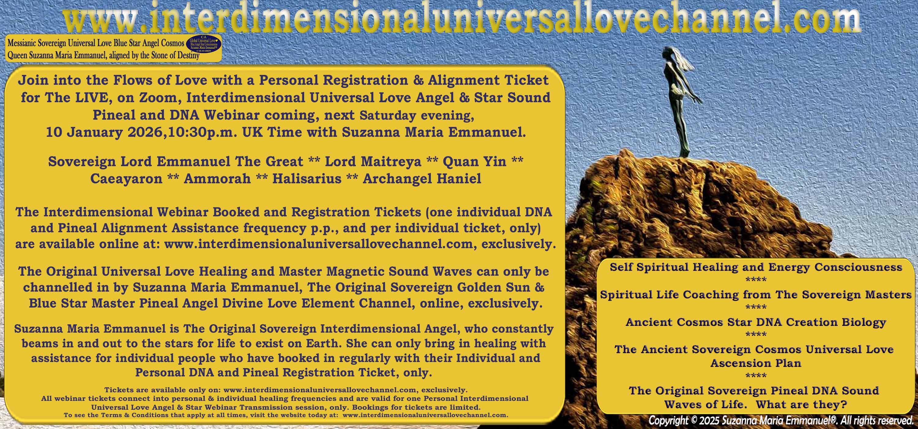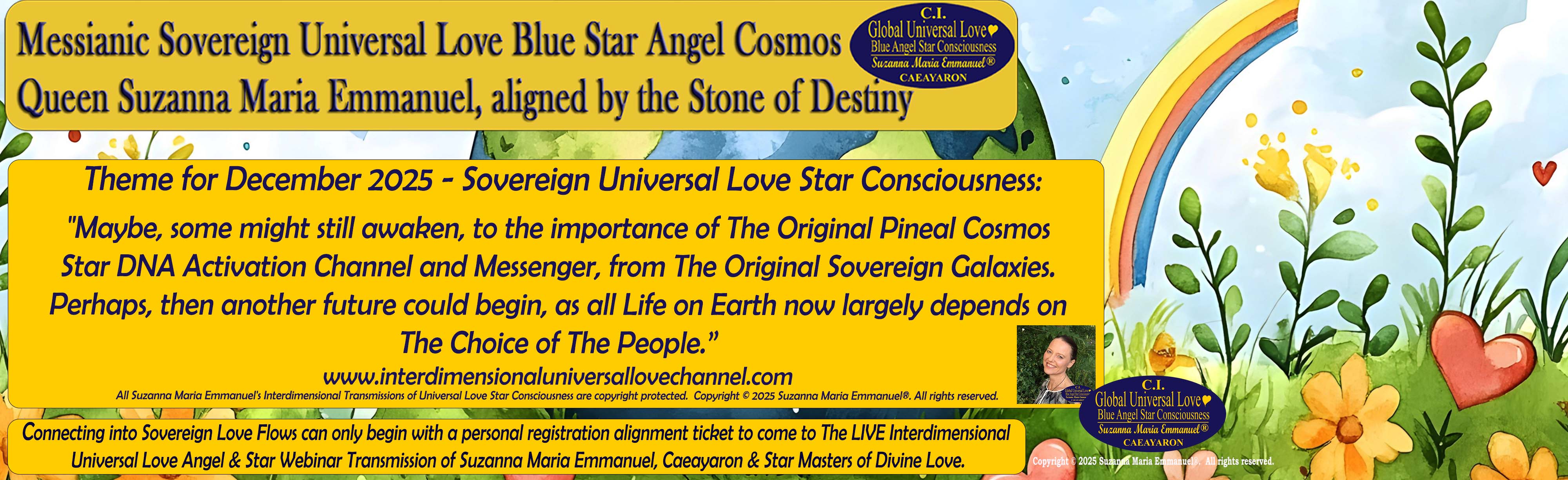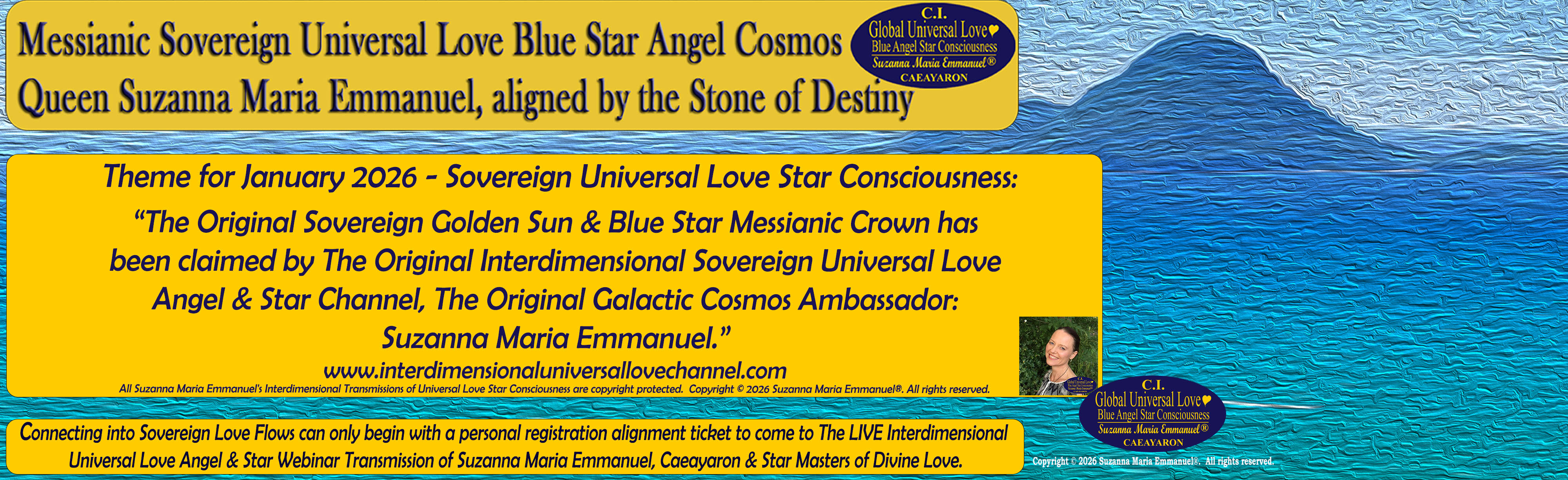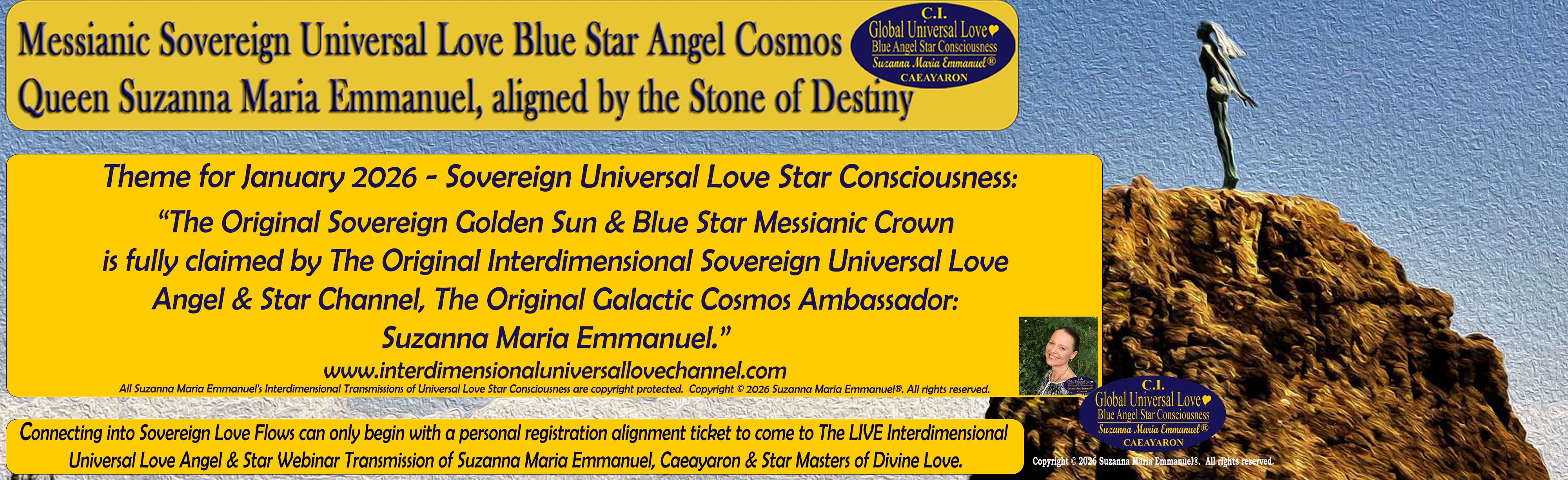 The Original Interdimensional Universal Love Angel & Master Webinar Transmissions of Suzanna Maria Emmanuel, Caeayaron and Sovereign Lord Emmanuel, together with the Angels and Star Galactic Federations of Universal Love Star Consciousness, can help to heal Earth and restore Earth's original Universal Love Star Consciousness Fields with Suzanna Maria Emmanuel's Original Master Flows coming in for Earth and people, to allow a new Truth Code for Peace to become possible.