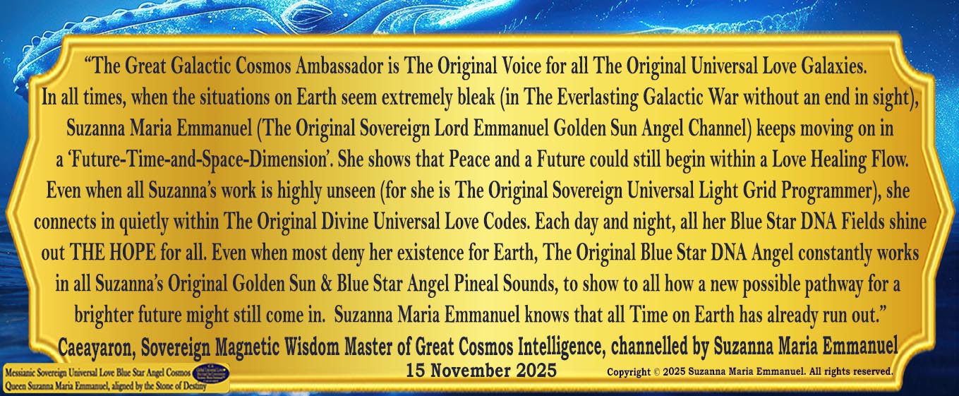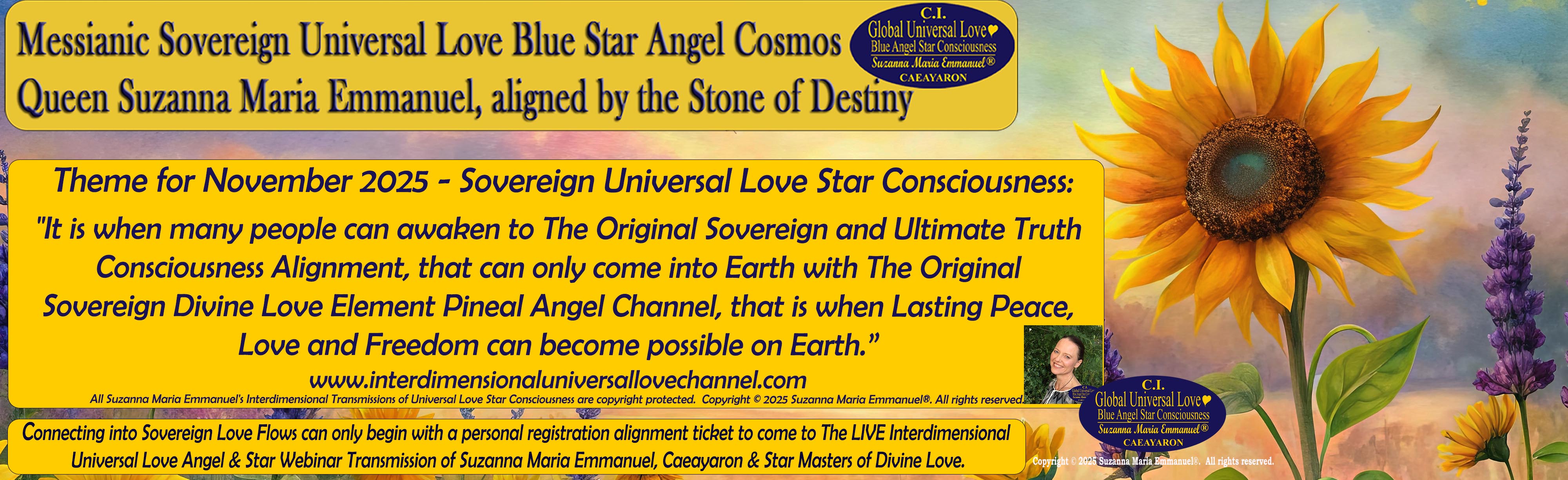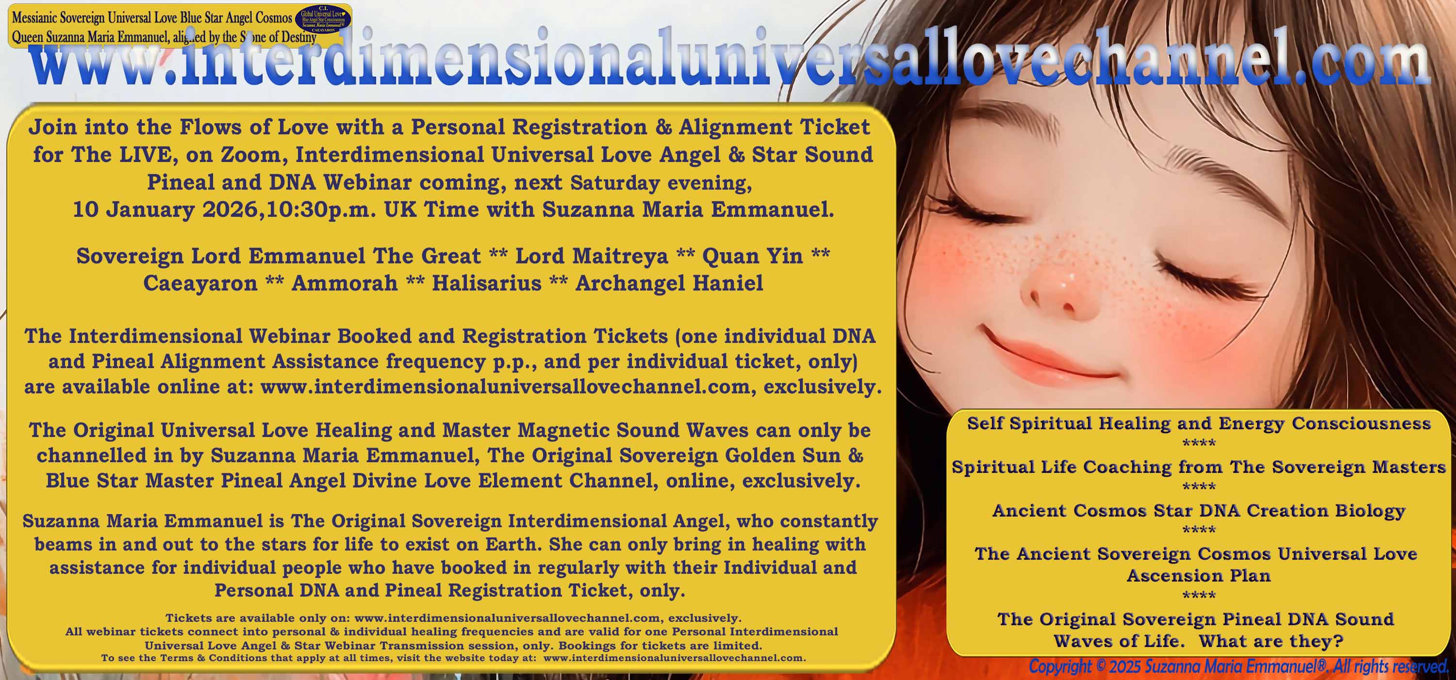 The Original Interdimensional Universal Love Angel & Master Webinar Transmissions of Suzanna Maria Emmanuel, Caeayaron and Sovereign Lord Emmanuel, together with the Angels and Star Galactic Federations of Universal Love Star Consciousness, can help to heal Earth and restore Earth's original Universal Love Star Consciousness Fields with Suzanna Maria Emmanuel's Original Master Flows coming in for Earth and people, to allow a new Truth Code for Peace to become possible.