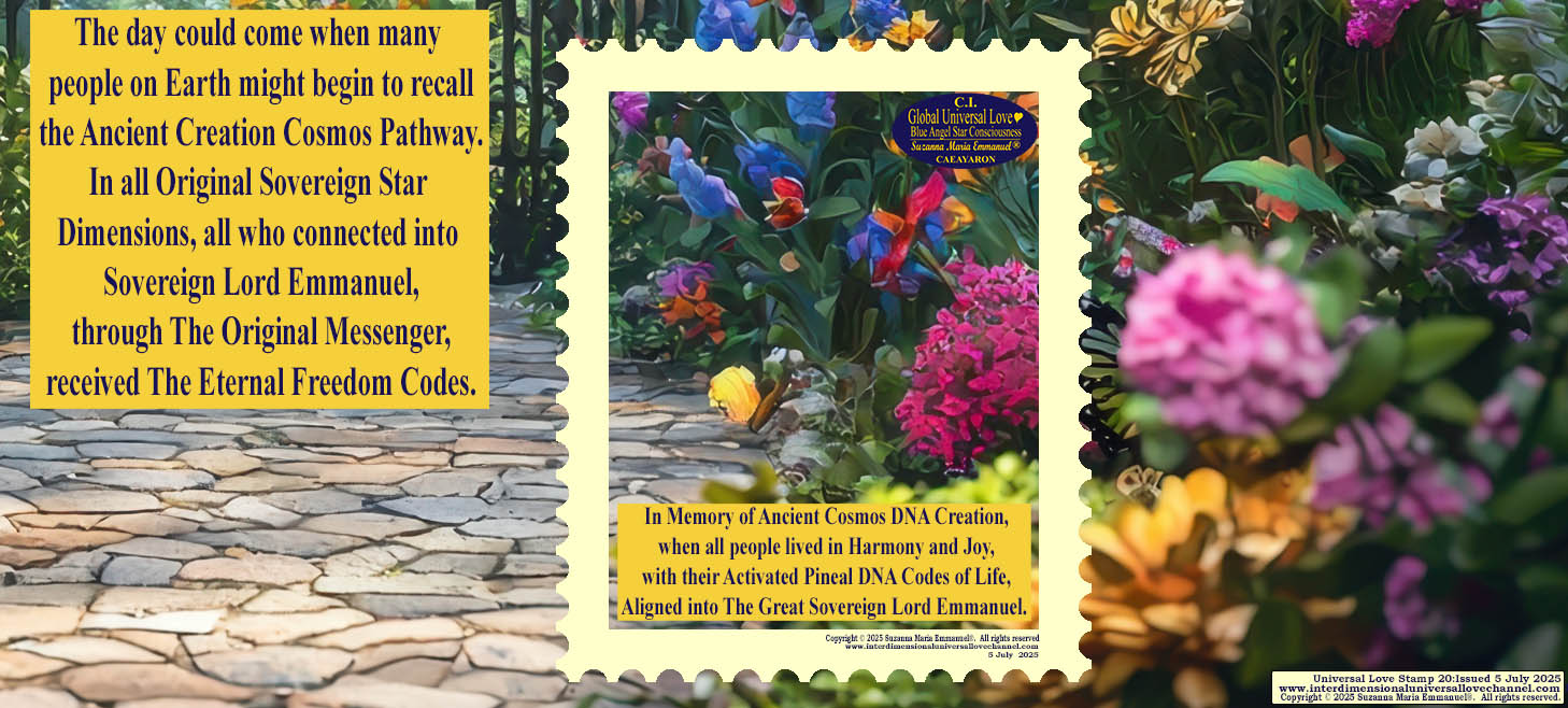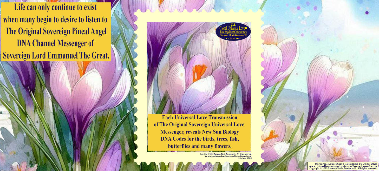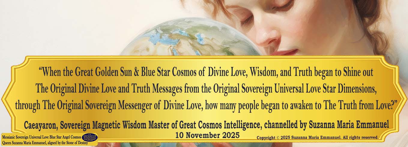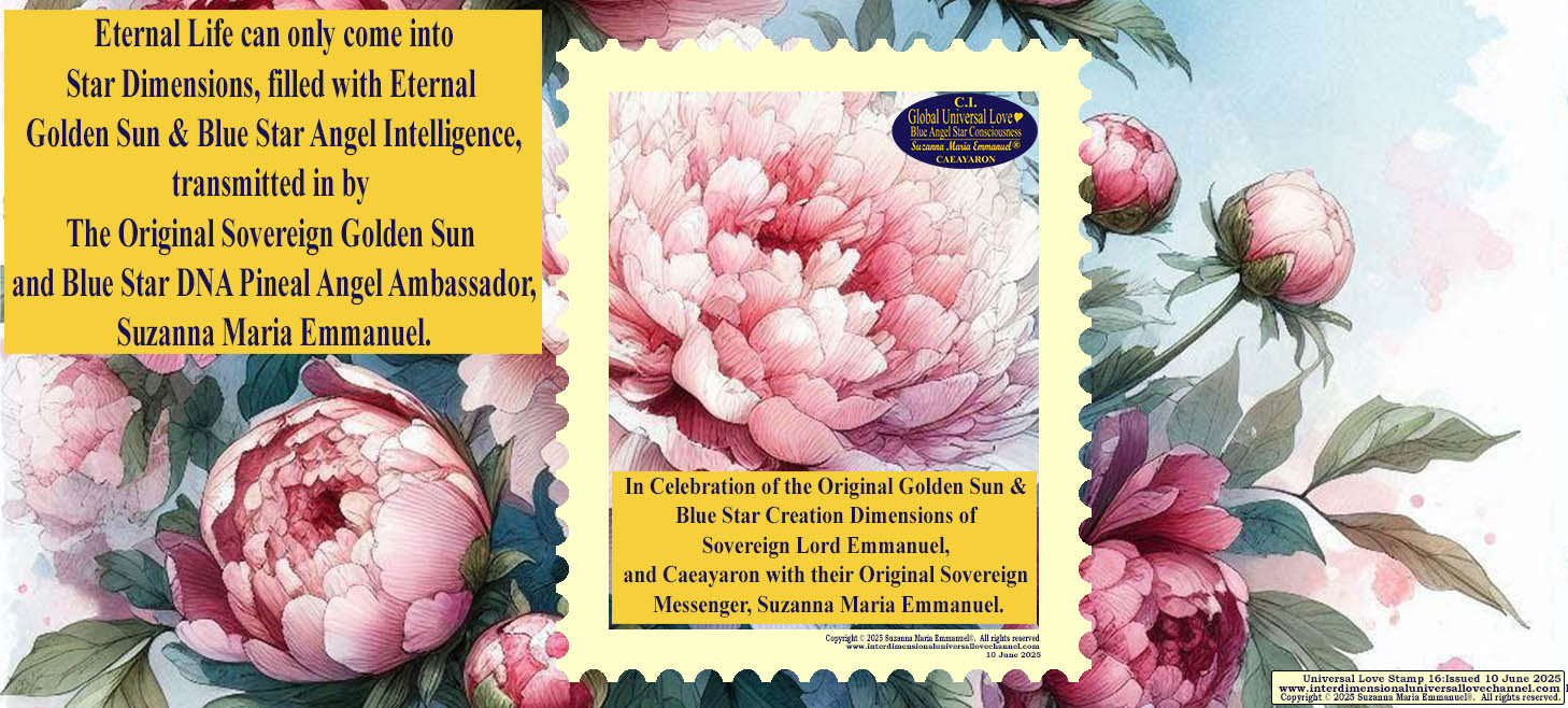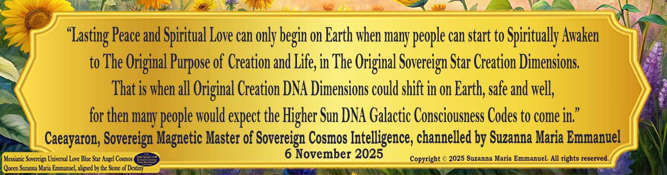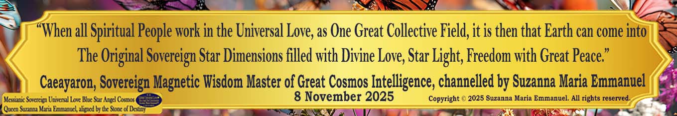 “The Time is here for all people to see: ‘The Original Universal Love Star Cosmos Path of Life’. Only The Original Sovereign Universal Love Golden Sun & Blue Star Cosmos Neuron Queen Pineal DNA Angel Channel, Suzanna Maria Emmanuel, can come into Earth every day and night from The Original Sovereign Cosmos Dimensions; filled with Sovereign Master & Galactic Cosmos Star Creation Intelligence.”