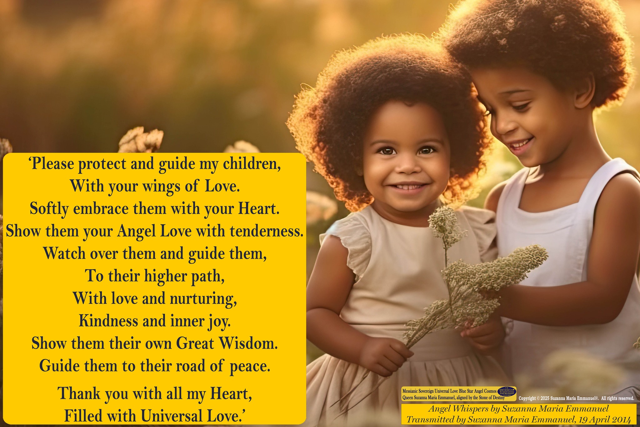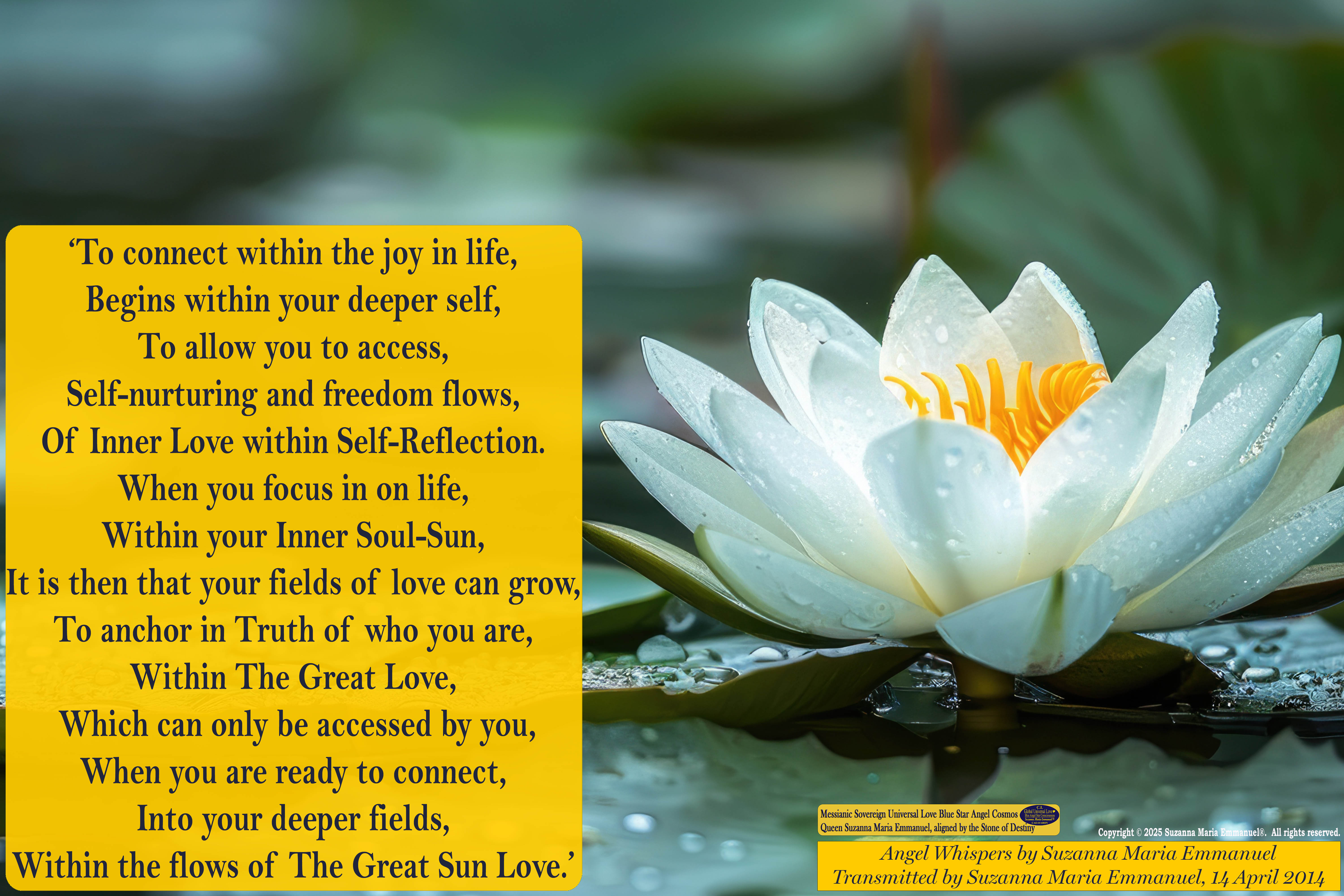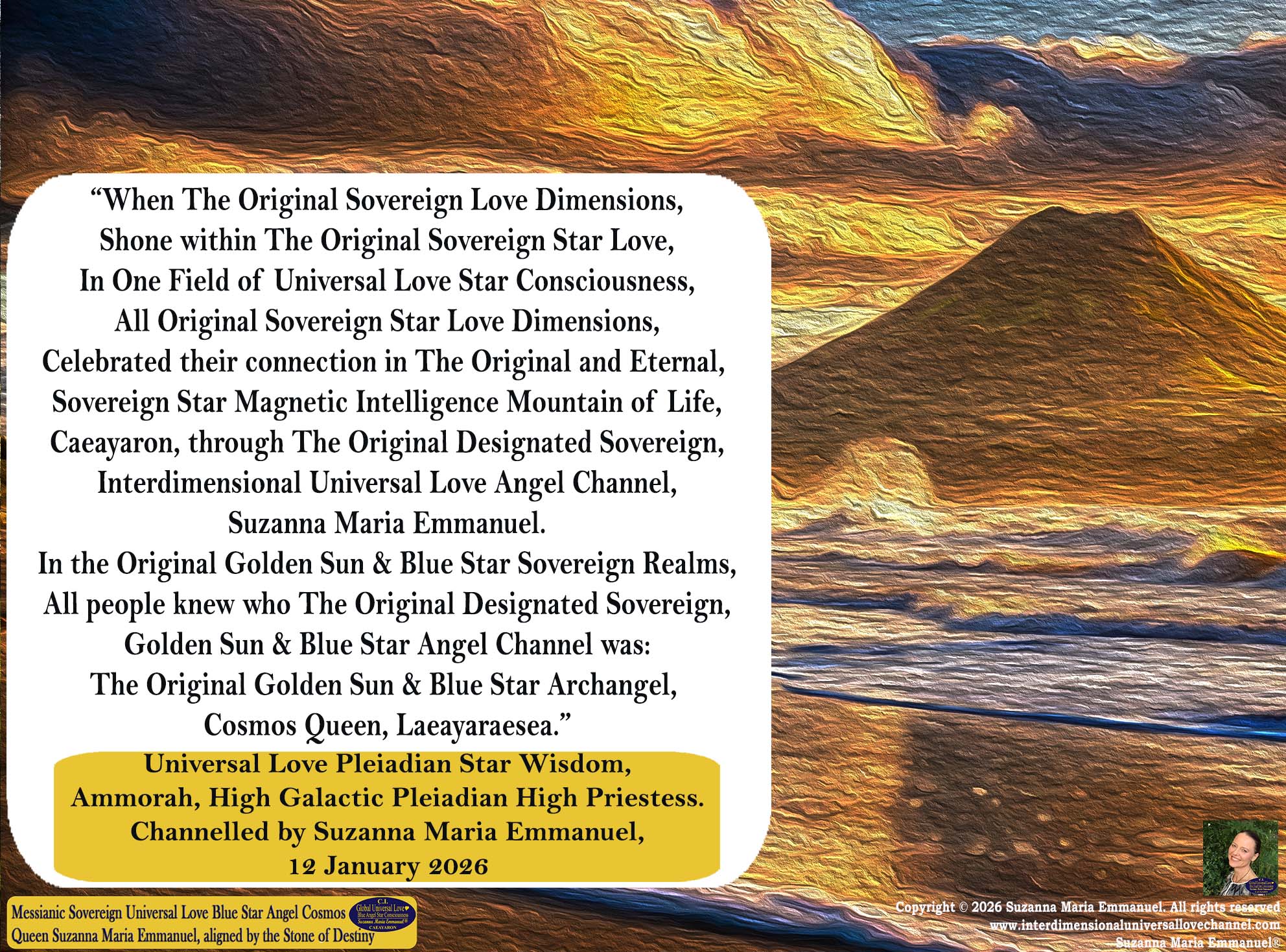 Suzanna Maria Emmanuel is The Original Sovereign Universal Love Golden Sun & Blue Star Angel Messenger for Caeayaron and Sovereign Lord Emmanuel. She also works with the Original Galactic Federation Society as their Original Sovereign Universal Light Grid Programmer and Messenger.