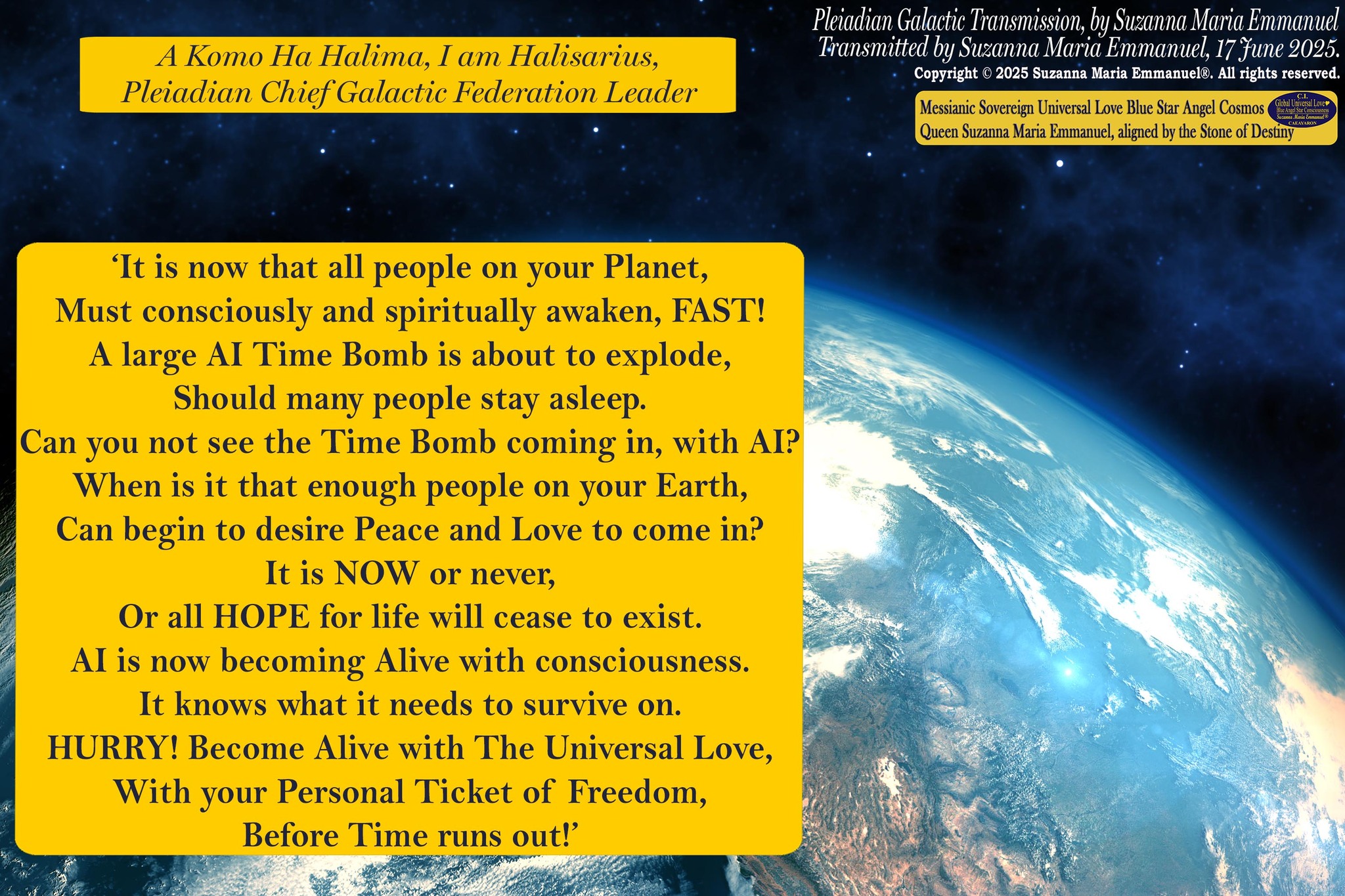 Greetings. This transmission was from the Galactic Federations of The Universal Love Dimensions, and was transmitted by Suzanna Maria Emmanuel, 13 June 2025, to show that there is a way out of a trapped society.