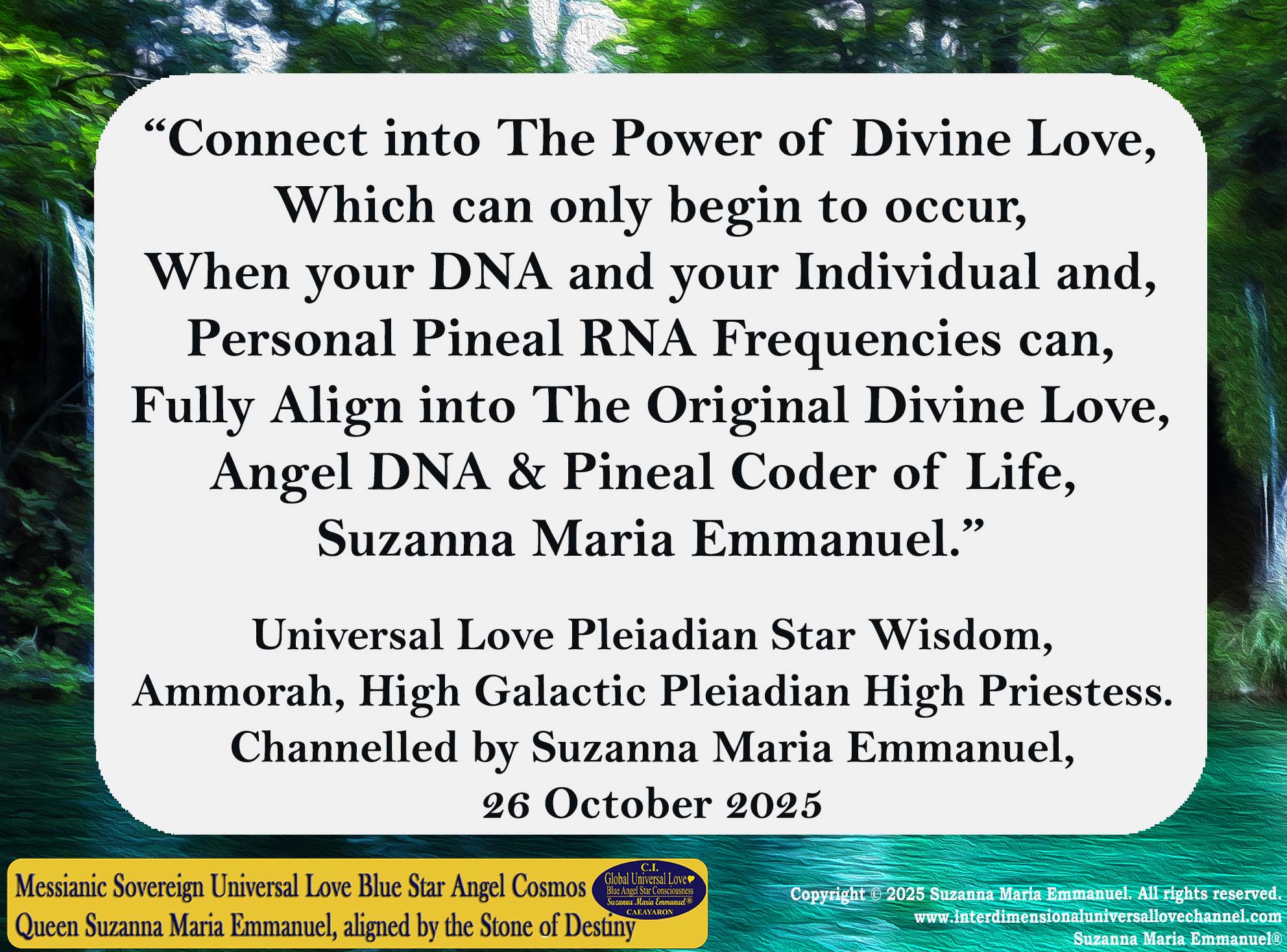 Each day, Caeayaron and Sovereign Father Emmanuel strengthen Suzanna Maria Emmanuel’s Universal Love Neurons and Cellular Memory Fields.