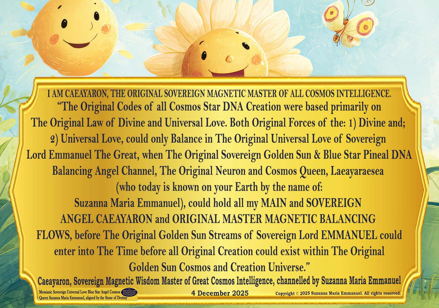 I, CAEAYARON, AM THE ORIGINAL SOVEREIGN MAGNETIC MASTER of the ORIGINAL SOVEREIGN CREATION and BALANCING REALMS. My Original Sovereign Universal Love Angel Channel, SUZANNA MARIA EMMANUEL, can accept all THE ORIGINAL MOUNTAIN OF LEMURIA LIGHT FIELDS, as she is The Original SOVEREIGN LORD EMMANUEL GOLDEN SUN ARCHANGEL CHANNEL.