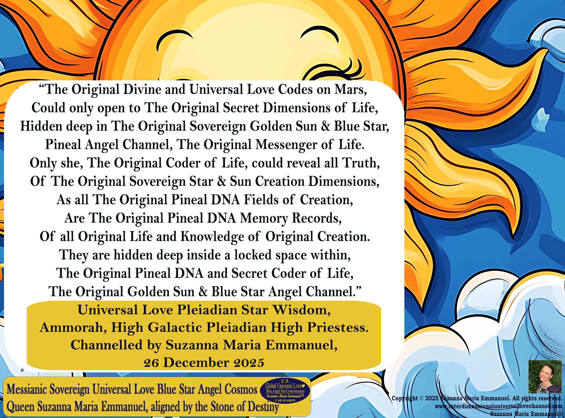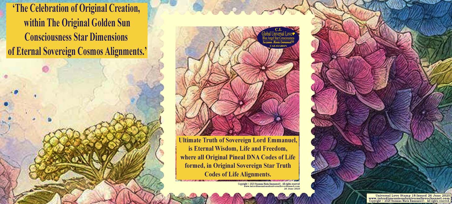 It is with all SUZANNA MARIA EMMANUEL’s Original BLUE STAR ENERGY FIELDS, that the ORIGINAL GOLDEN SUN ANGEL PEOPLE (who once had their Individual Golden Soul-Sun Codes of Life), could inherit all Original Star Dimensions with The Codes of COSMOS QUEEN LAEAYARAESEA, with her ORIGINAL SOVEREIGN EMMANUEL CHANNEL OF SUZANNA MARIA EMMANUEL.