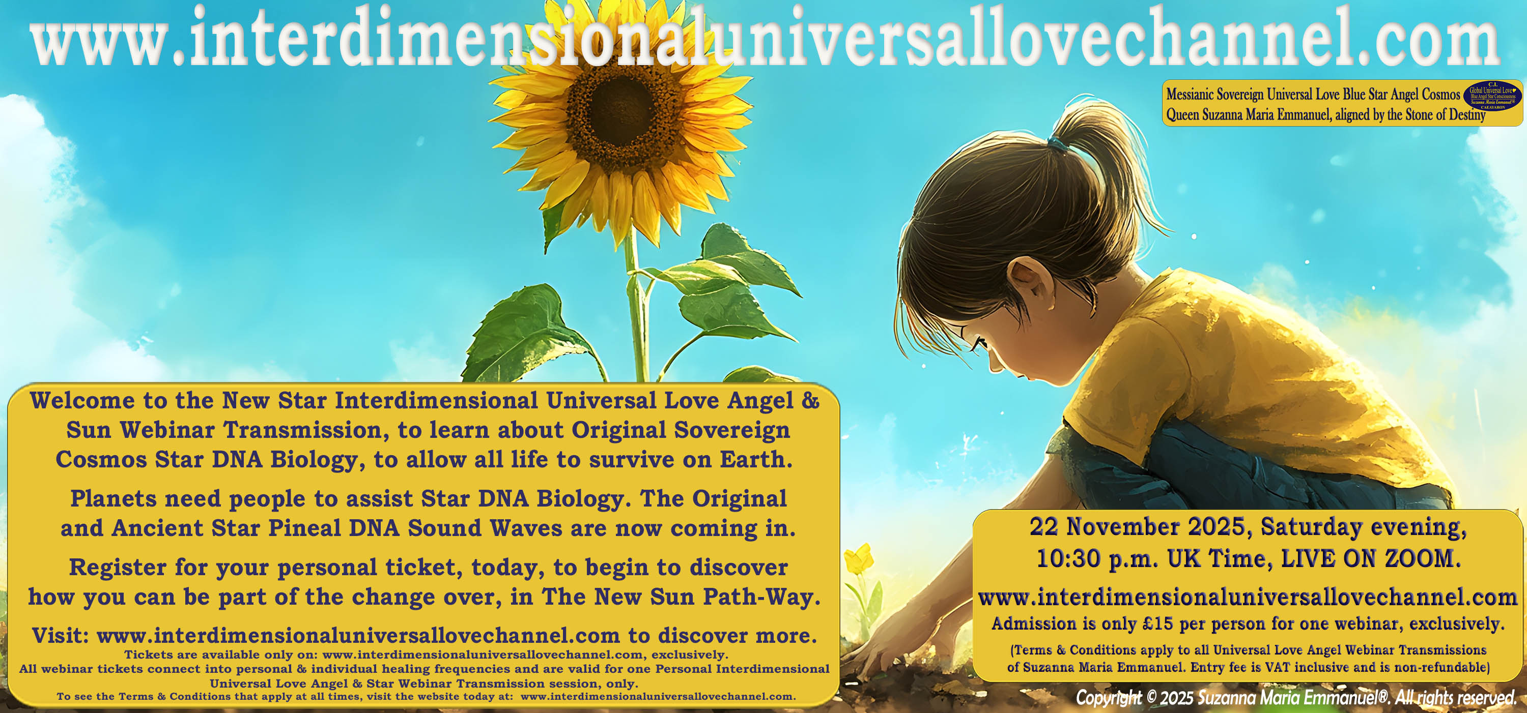 The only way that Suzanna Maria Emmanuel’s Original Golden Sun & Blue Star Pineal Master and Angel Channels can help humanity, life on Earth, and Earth’s Star Planet (in the centre of Earth), to come into a safer dimension well away from the dark human cyber net corruption fields, is when many people choose to come to the Interdimensional Universal Love Angel and Star Webinar Transmission, regularly, by purchasing their own Individual DNA Alignment Ticket.