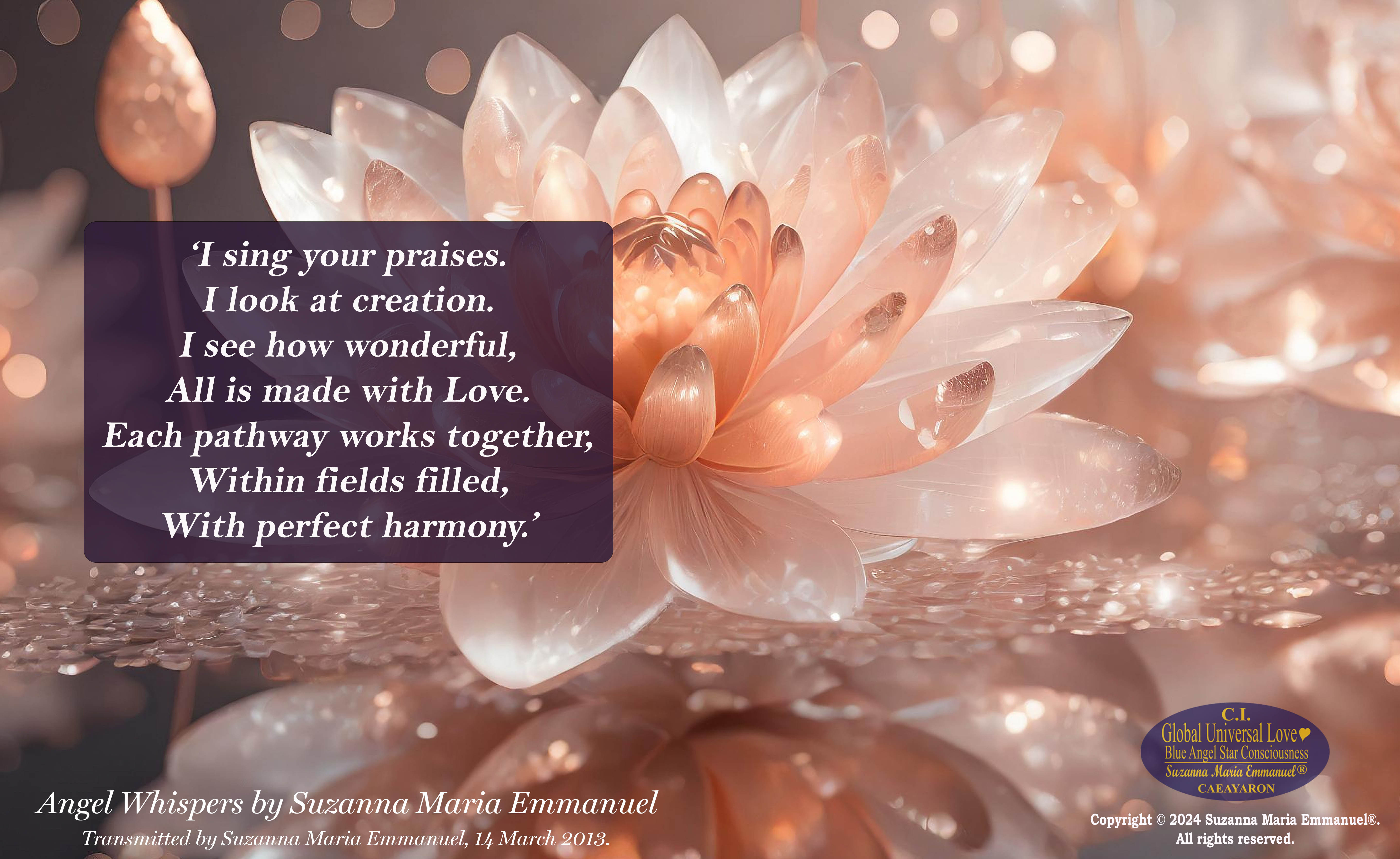Thank you dear Suzanna Suzanna Maria Emmanuel for being here with us, and the beautiful & magnificent creation that Earth is For the transmissions of Divine Love, to awaken and remember that which may be possible, for the One Love & Truth pathway Divine Universal Love Always & Eternally