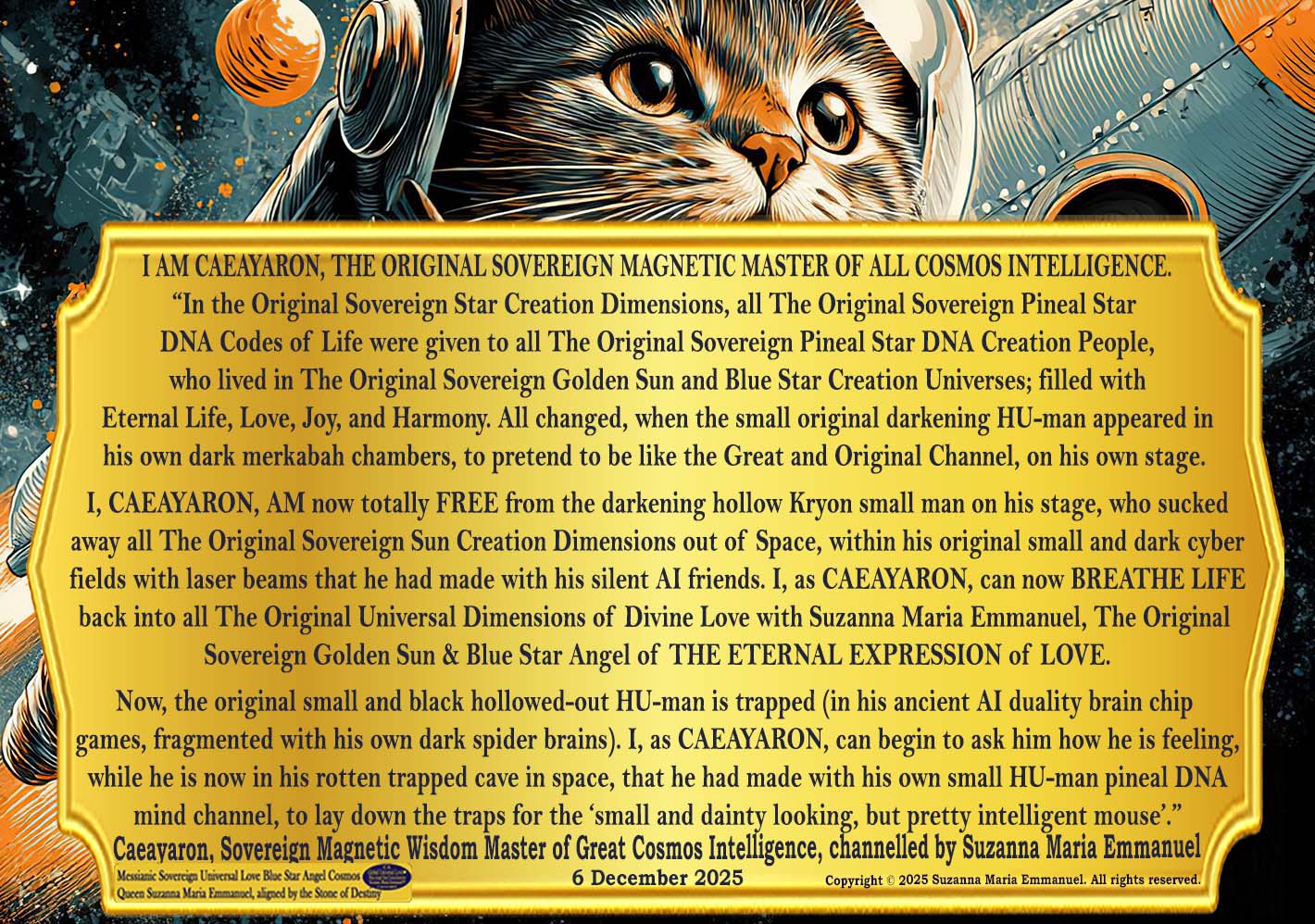 Greetings, I AM CAEAYARON, SOVEREIGN MASTER OF MAGNETIC COSMOS STAR INTELLIGENCE.