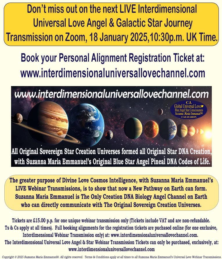 All Suzanna Maria Emmanuel's Interdimensional Star Intellect Transmissions of Universal Love Star Consciousness carry a professional and Legal Disclaimer & Indemnity, Copyright Protection and a Trademark Clause.