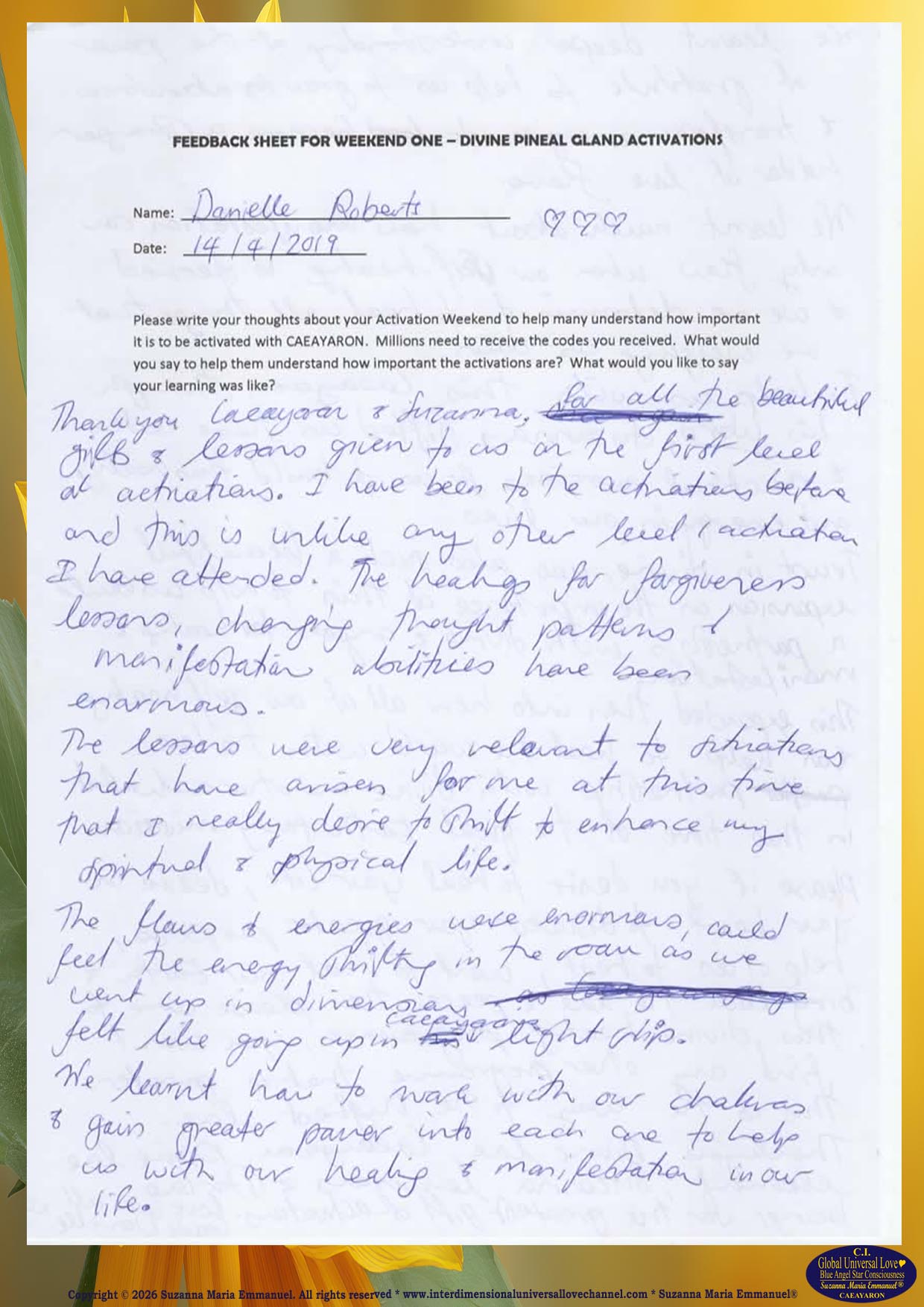 17. Testimony from Danielle: The Divine and Universal Love Pineal Gland DNA Activation Events: April 2019, page 2.