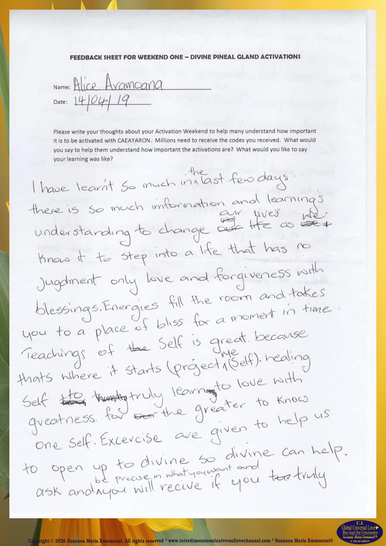 19. Testimony from Alice: The Divine and Universal Love Pineal Gland DNA Activation Events: April 2019.