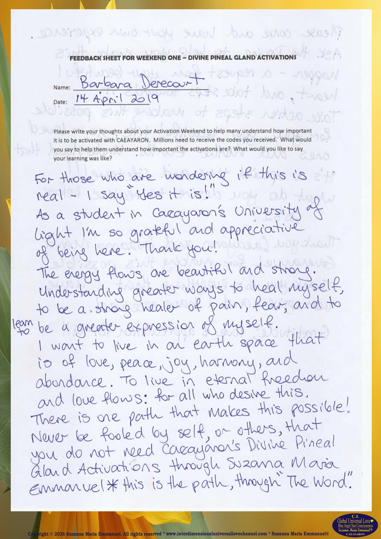 16. Testimony from Barbara: The Divine and Universal Love Pineal Gland DNA Activation Events: April 2019, page 2.