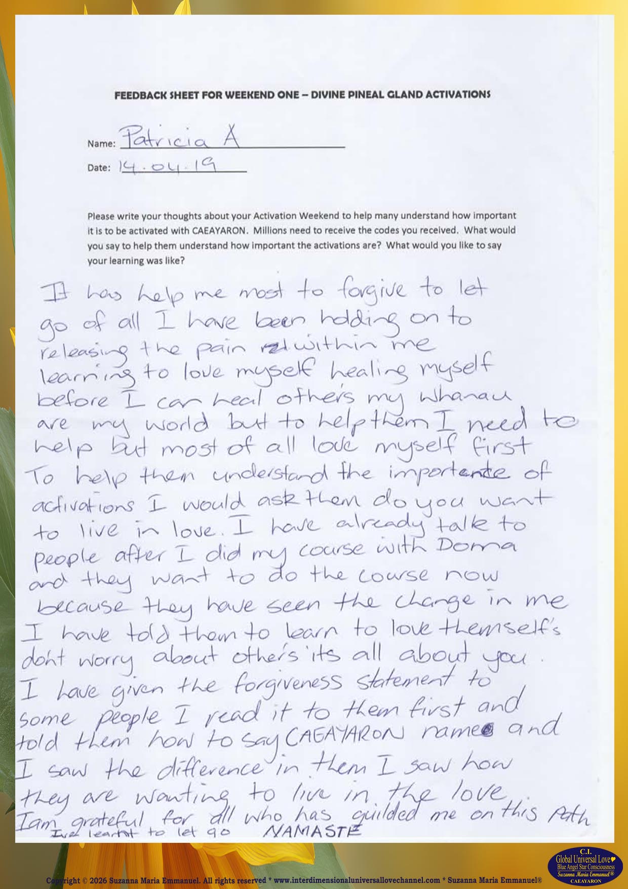 21. Testimony from Patricia: The Divine and Universal Love Pineal Gland DNA Activation Events: April 2019.